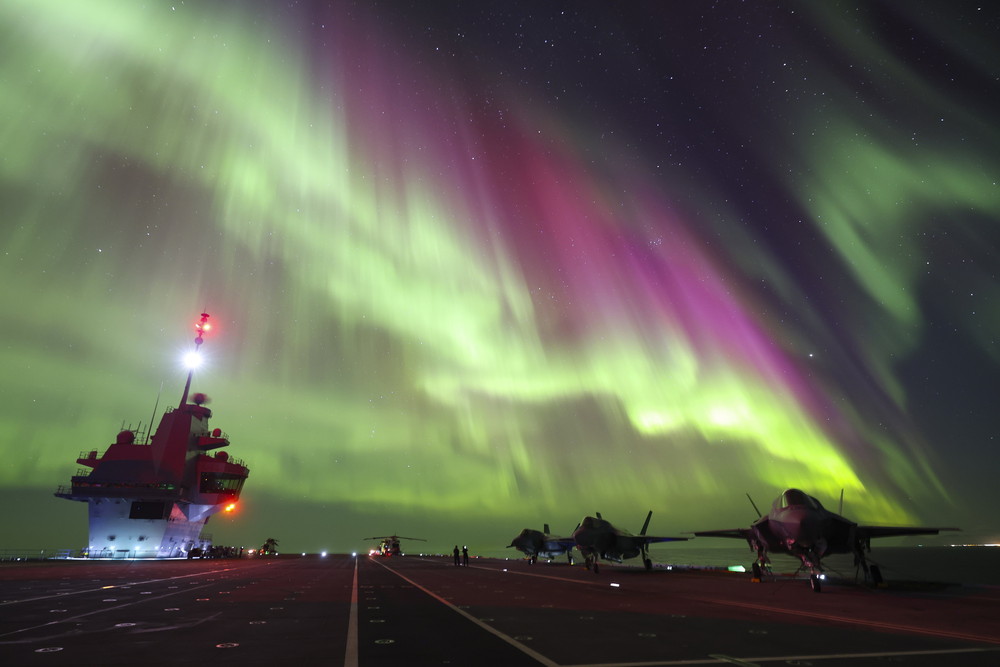 In this photo provided by Britain's Ministry of Defense, on Monday, March 4, 2024, F-35B Lightning jets are parked at a flight deck of HMS Prince of Wales aircraft carrier of the Royal Navy, under the northern lights (Aurora Borealis) near the coast of Norway, Sunday, March 3, 2024. (Photo by UK Ministry of Defence via AP Photo)