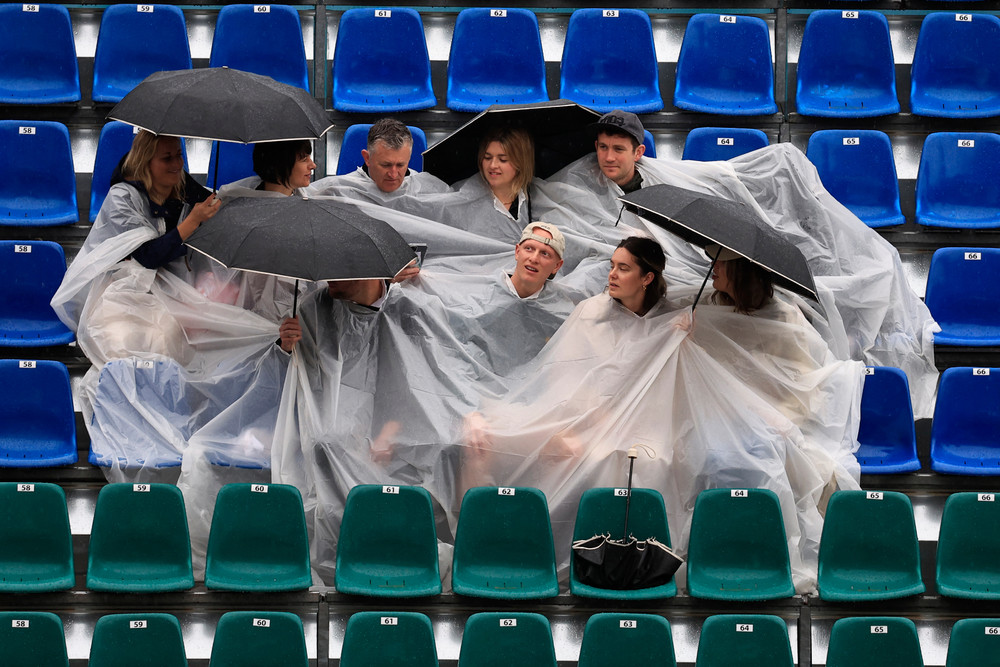 Spectators with umbrellas sit next to empty spectator seats as tennis matches are delayed due to weather conditions, during the Monte Carlo ATP Masters Series Tournament at the Monte Carlo Country Club on April 9, 2024. (Photo by Valéry Hache/AFP Photo)