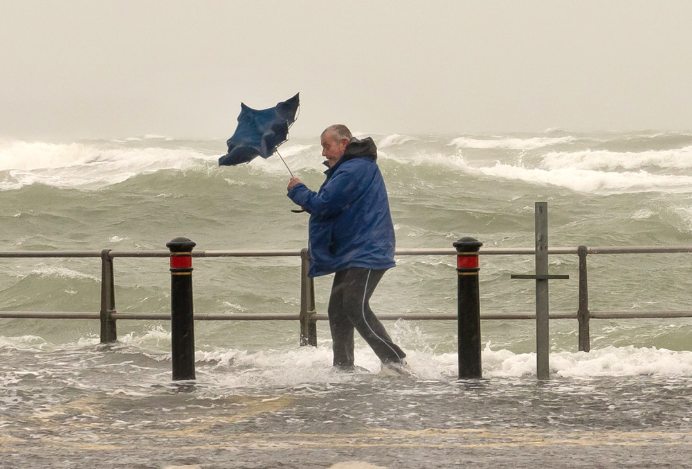 Someone struggles with an umbrella on Mudeford Quay seafront in Dorset, UK during storm Nelson on March 28, 2024. (Photo by Steve Hogan/Picture Exclusive)