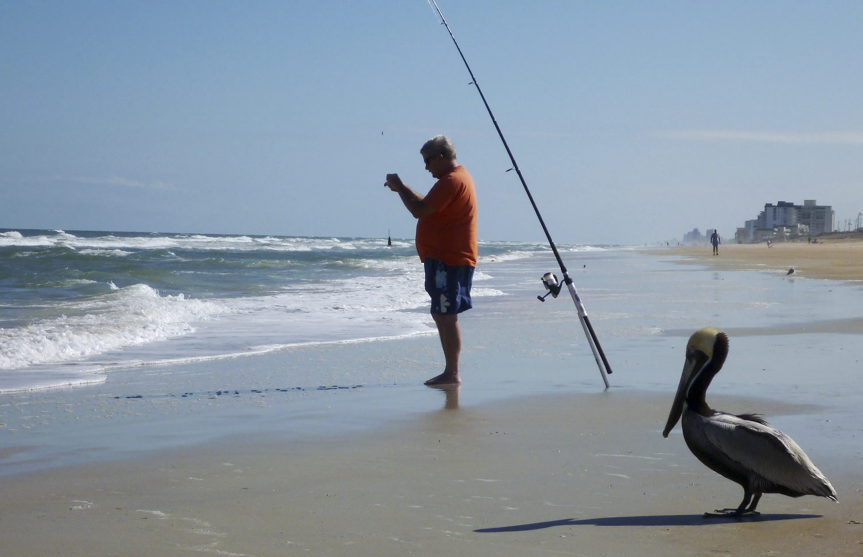 John Haggerty, from Port Orange, Florida, fishes next to a pelican along the Atlantic Ocean coastline in the 70 Fahrenheit (21 Celsius) degree weather at Ormond by the Sea, Florida, while a blizzard continued to pummel the Northeastern United States, February 9, 2013. (Photo by Larry Downing/Reuters)