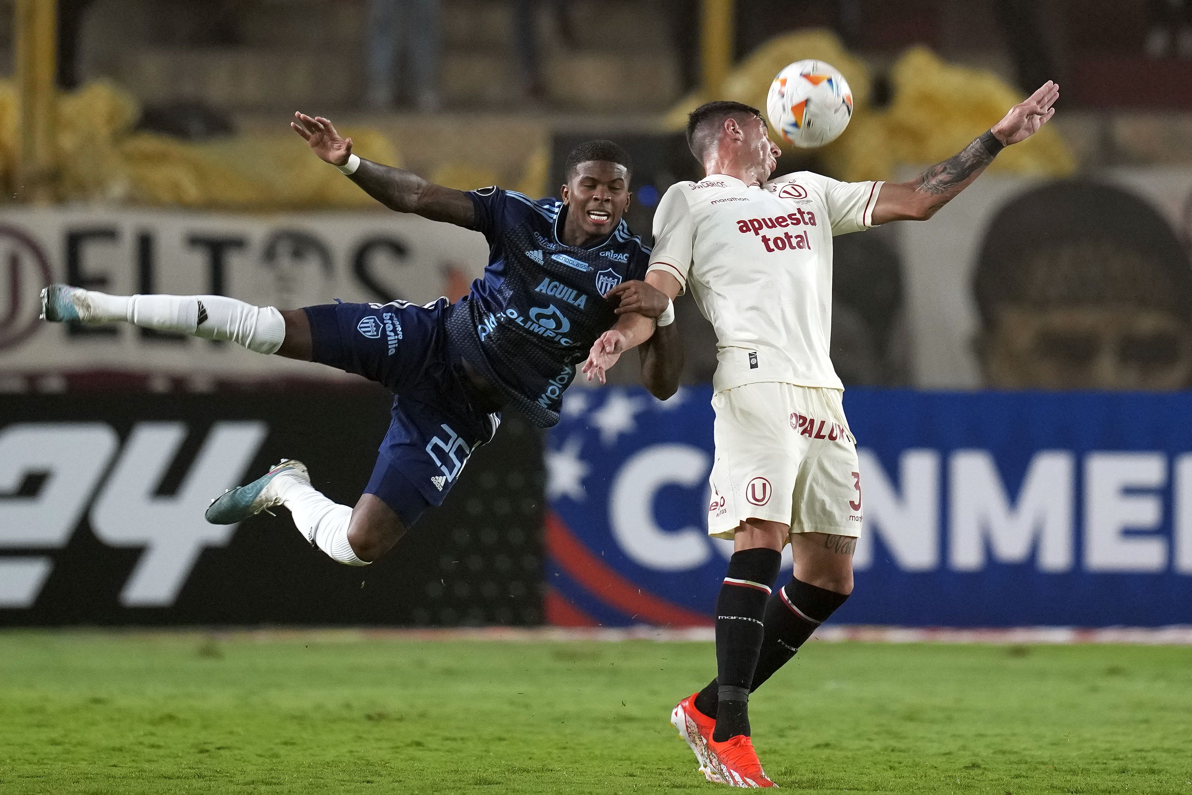Brayan Ceballos, left, of Colombia's Junior and Diego Dorregaray of Peru's Universitario, battle for the ball during a Copa Libertadores Group D soccer match at the Monumental stadium in Lima, Peru, Tuesday, May 7, 2024. (Photo by Martin Mejia/AP Photo)