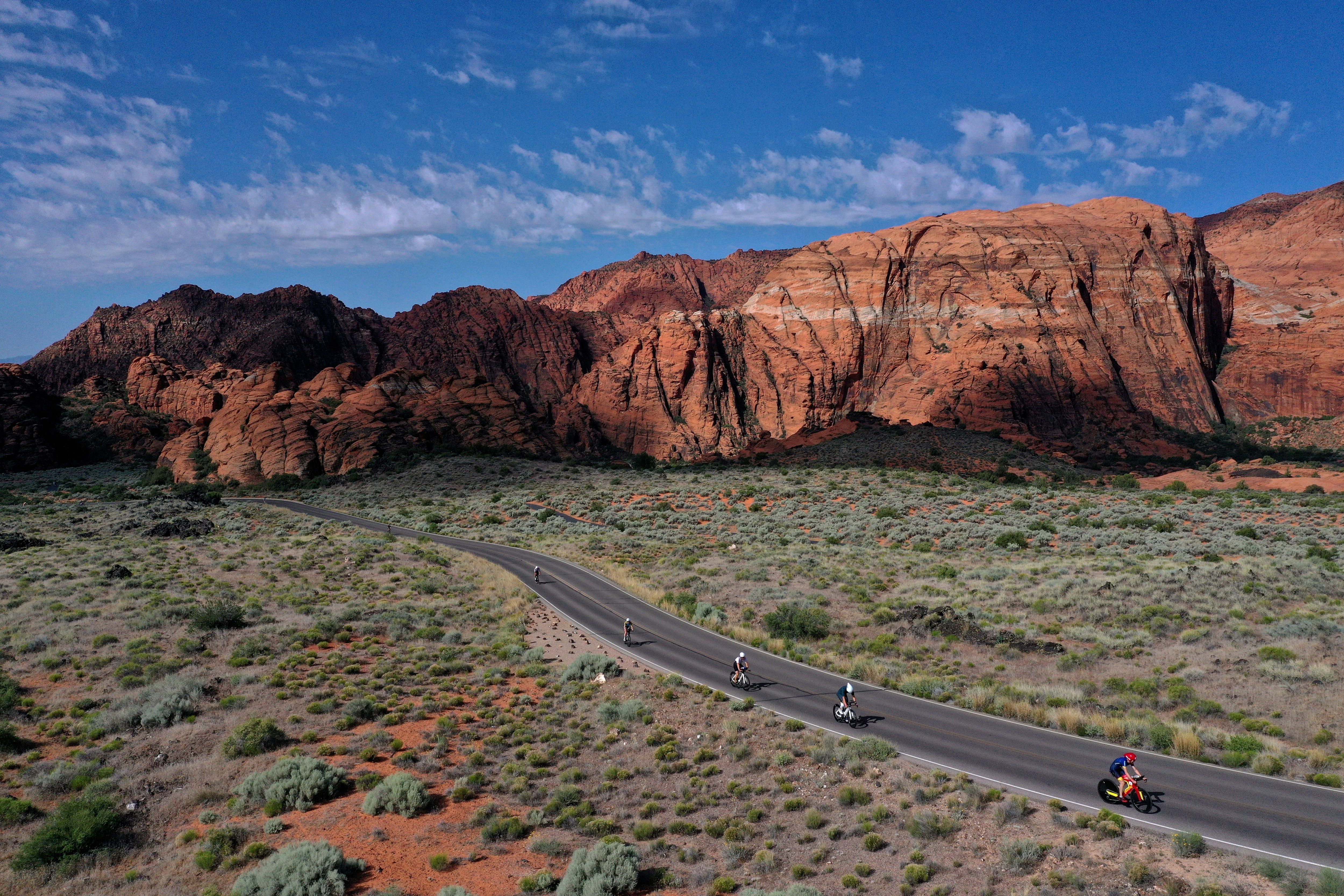 An aerial view of athletes competing in the bike portion of the 2024 Intermountain Health IRONMAN 70.3 North American Championship in Snow Canyon State Park on May 04, 2024 in St George, Utah. (Photo by Ezra Shaw/Getty Images for IRONMAN)