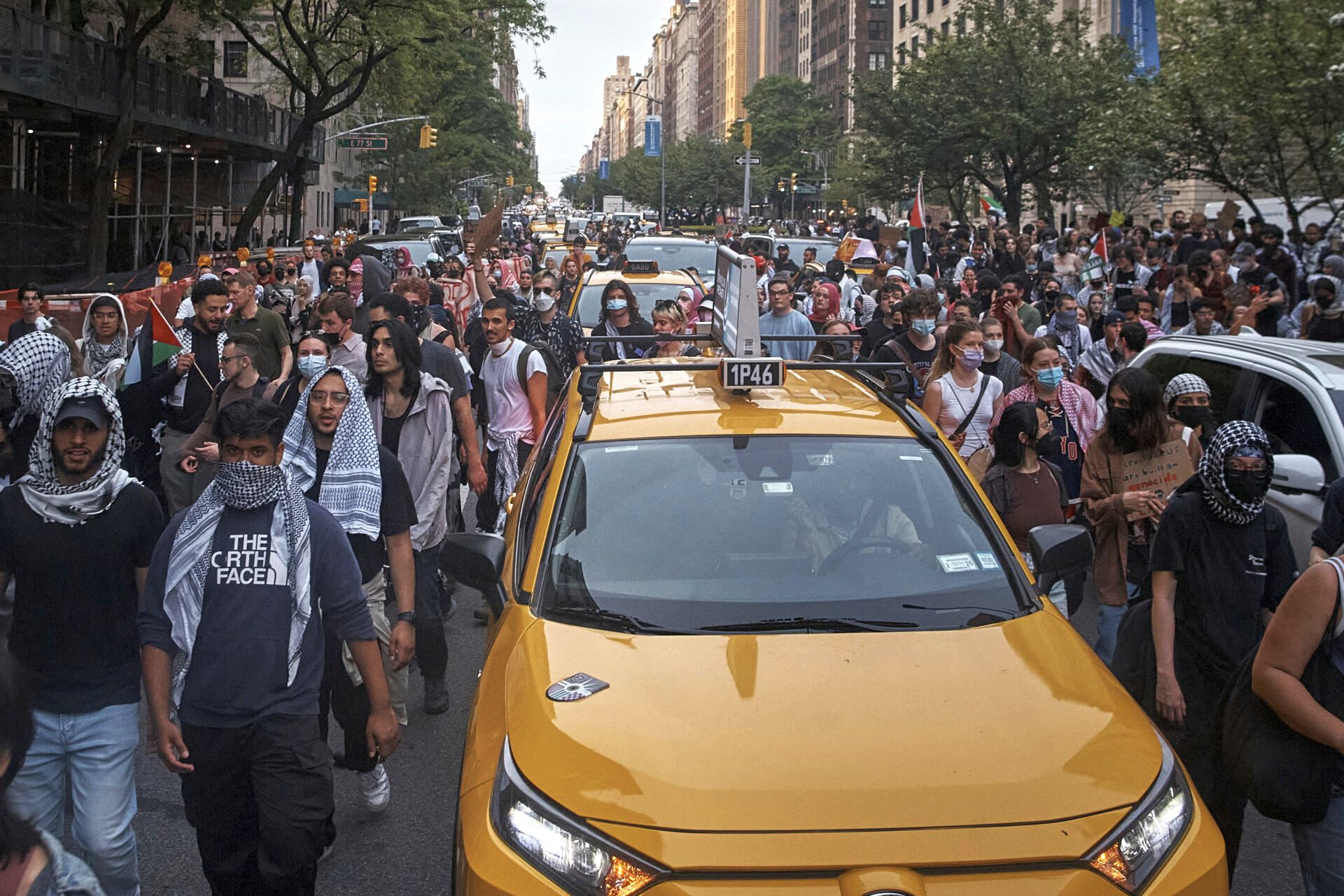 Pro-Palestinian protesters march in between traffic near the Metropolitan Museum of Art, where the Met Gala takes place, Monday, May 6, 2024, in New York. (Photo by Andres Kudacki/AP Photo)