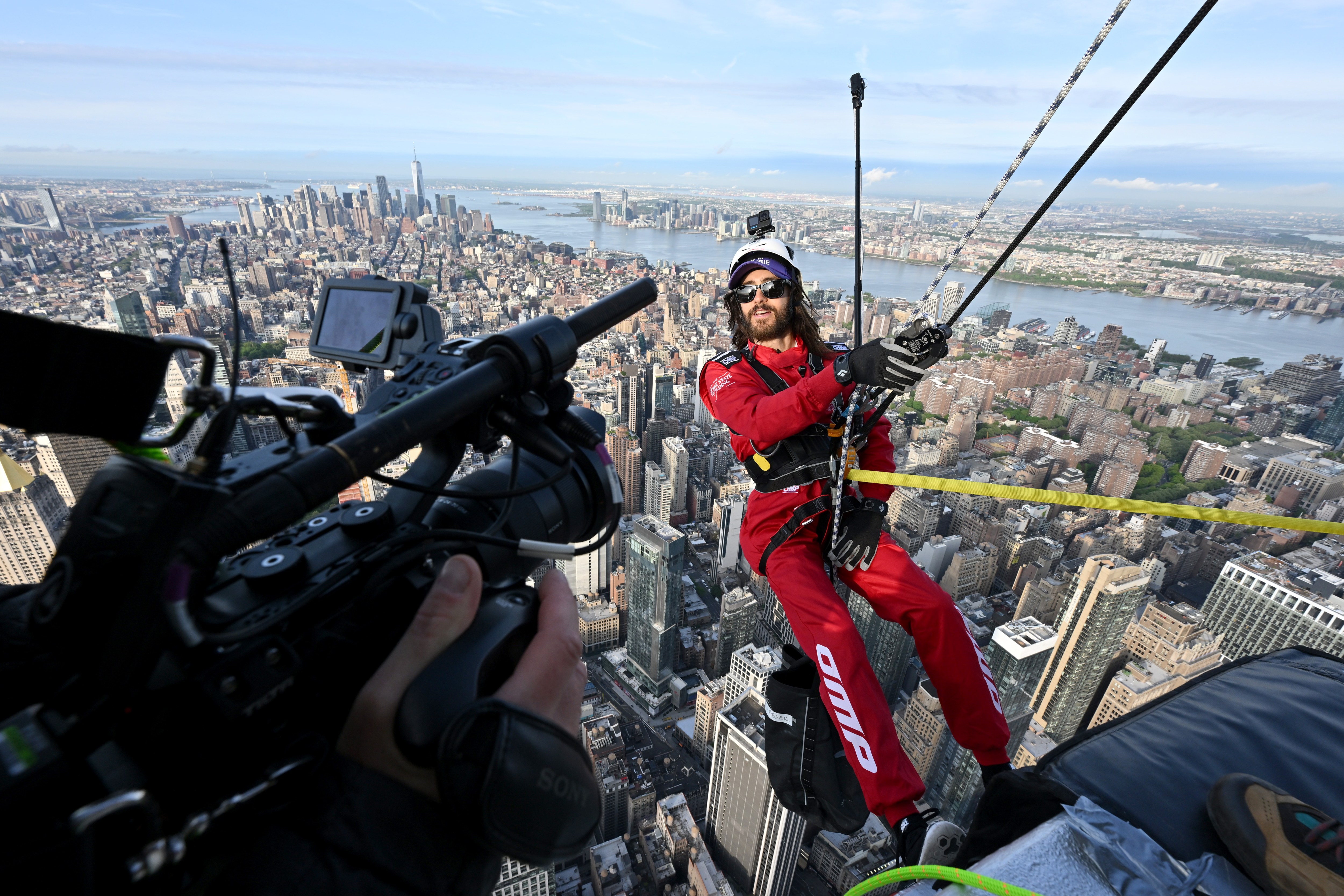 In this image released on May 6, American actor and musician Jared Leto rappels down the Empire State Building in New York City. (Photo by Roy Rochlin/Getty Images for Empire State Realty Trust)