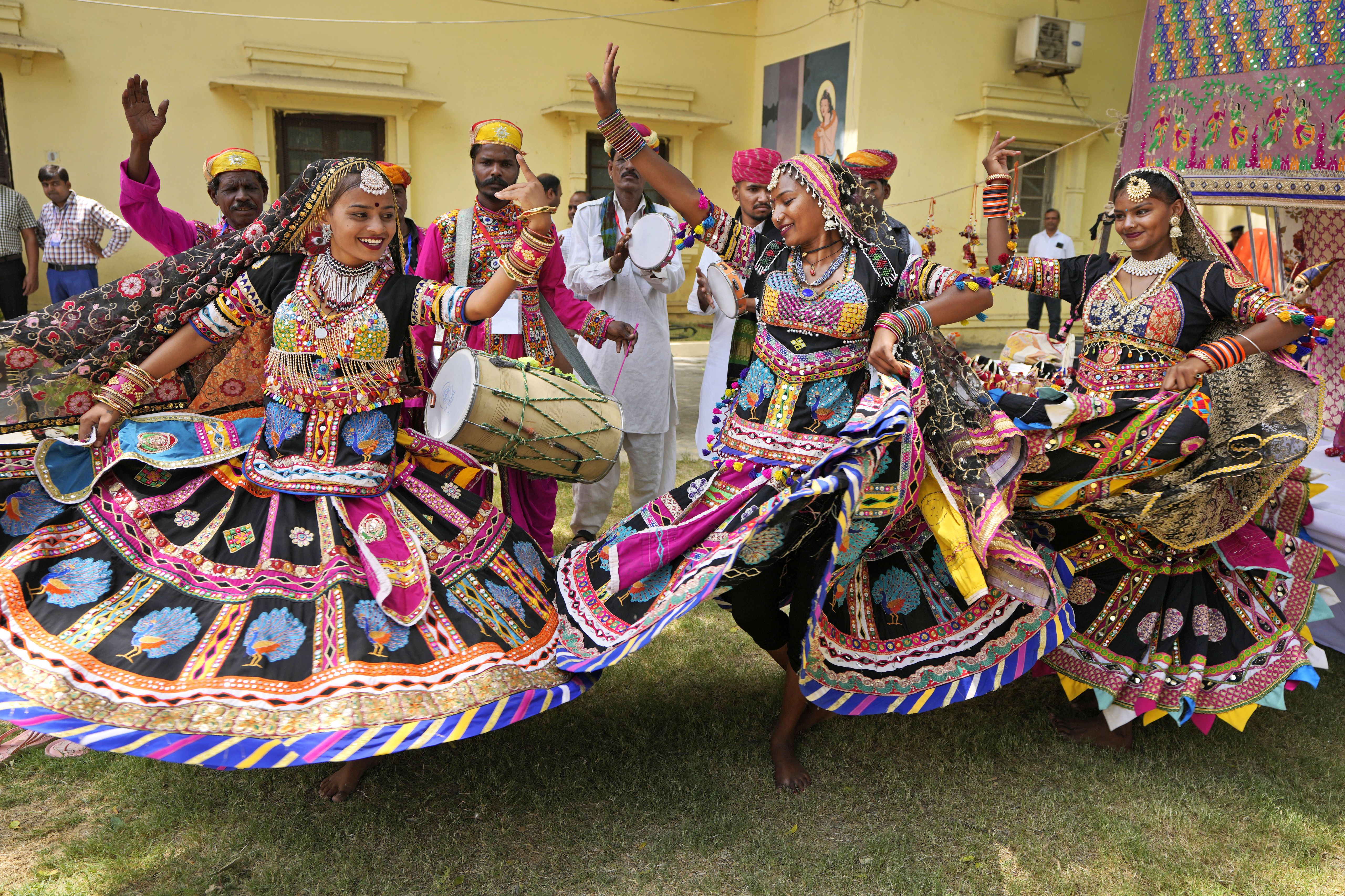 Folk artists from Rajasthan state perform a traditional dance during the alumni meet at the University of Allahabad in Prayagraj, Uttar Pradesh, India, April 28, 2024. (Photo by Rajesh Kumar Singh/AP Photo)