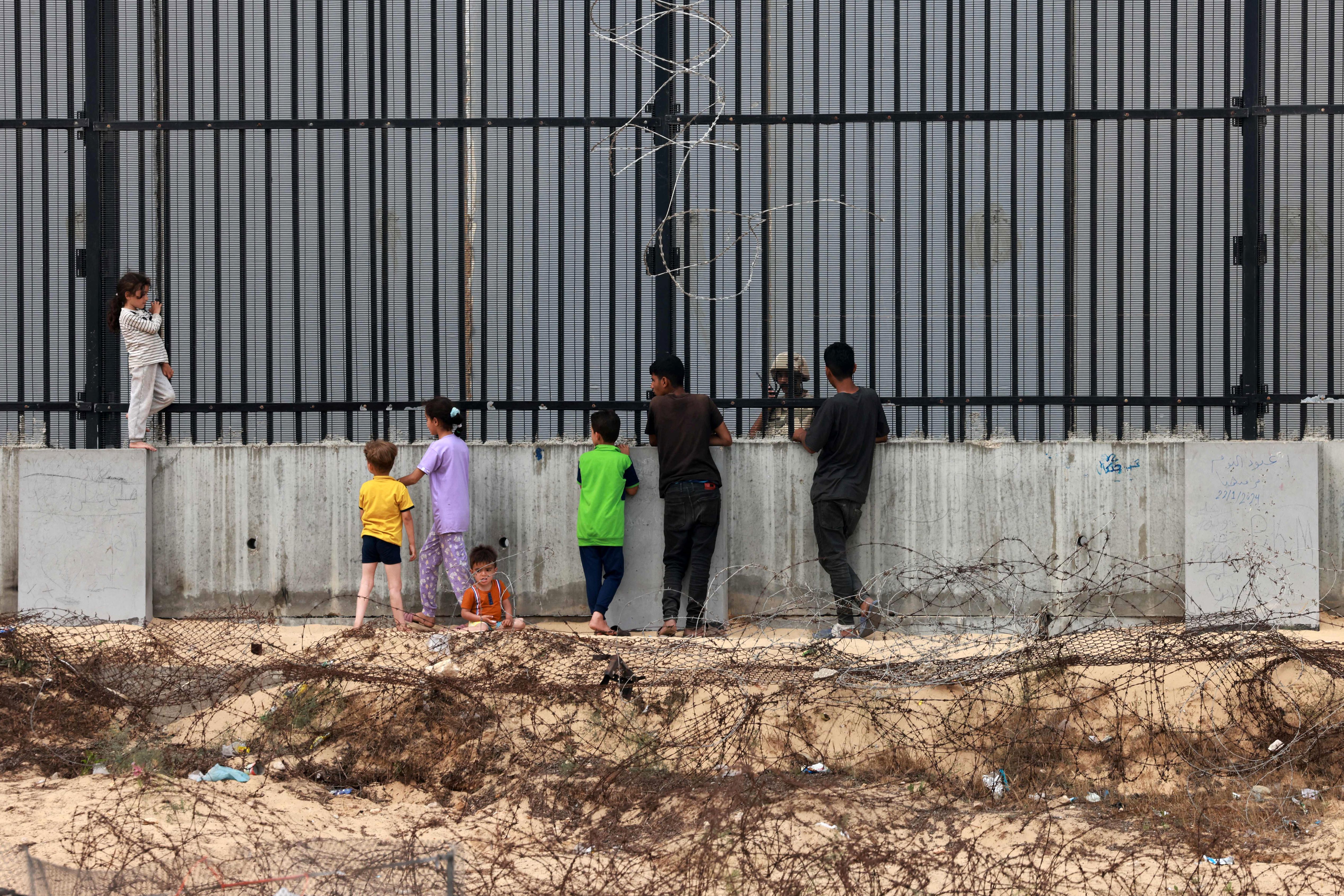 Displaced Palestinian children chat with an Egyptian soldier standing guard behind the fence between Egypt and Rafah in the southern Gaza Strip on April 26, 2024, amid the ongoing conflict between Israel and the Palestinian militant group Hamas. (Photo by Mohammed Abed/AFP Photo)