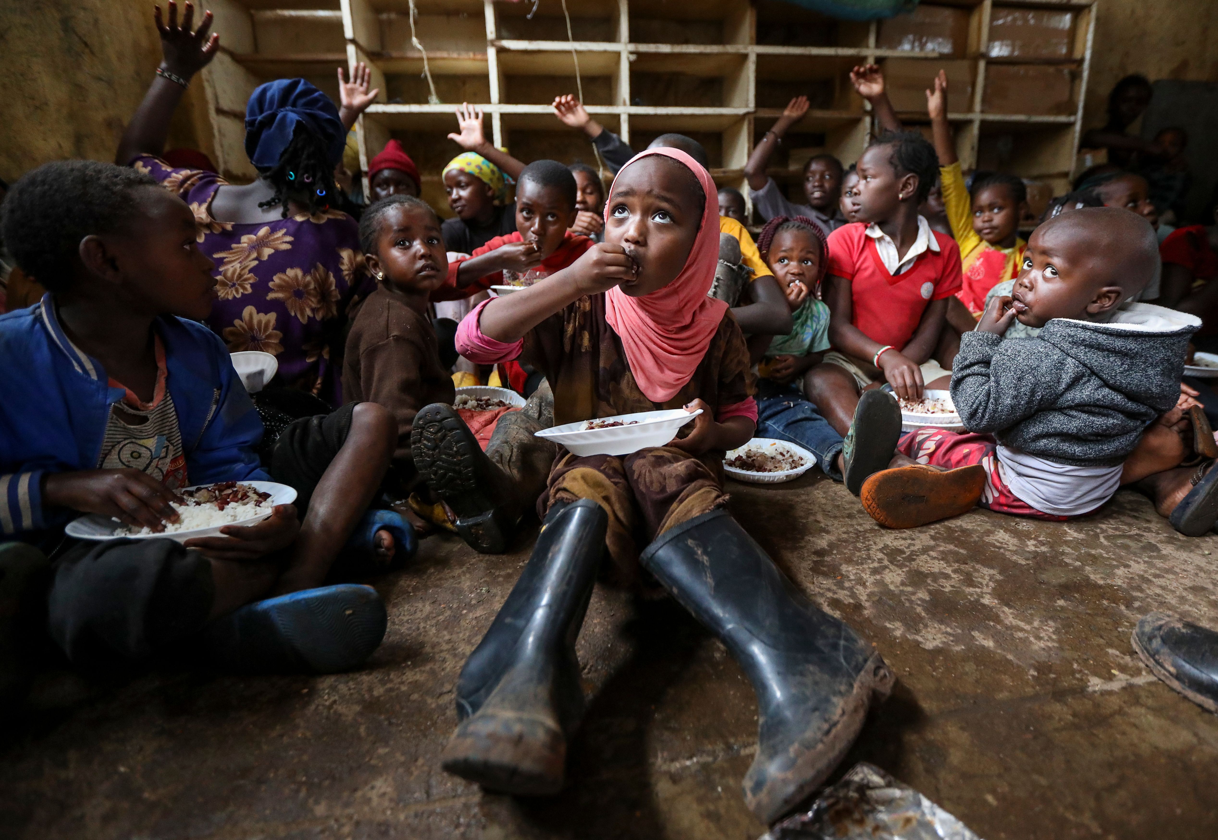 Displaced children eat a meal prepared by volunteers for the displaced families, a day after the Gitathuru river overflowed and broke its banks due to heavy rainfall damaging their surrounding neighborhoods, in the Ngondo village, in Mathare, Nairobi, Kenya, 25 April 2024. According to the Kenya Red Cross Society, the floodings left at least 32 dead, 15 injured and at least 103,485 people have been affected by the March-May long rains that continue to rise, including 40,265 people displaced, as of 18 April 2024. Kenya's meteorological department predicts more heavy rainfall this week, as floods continue to destroy properties in various parts of the country. (Photo by Daniel Irungu/EPA/EFE)