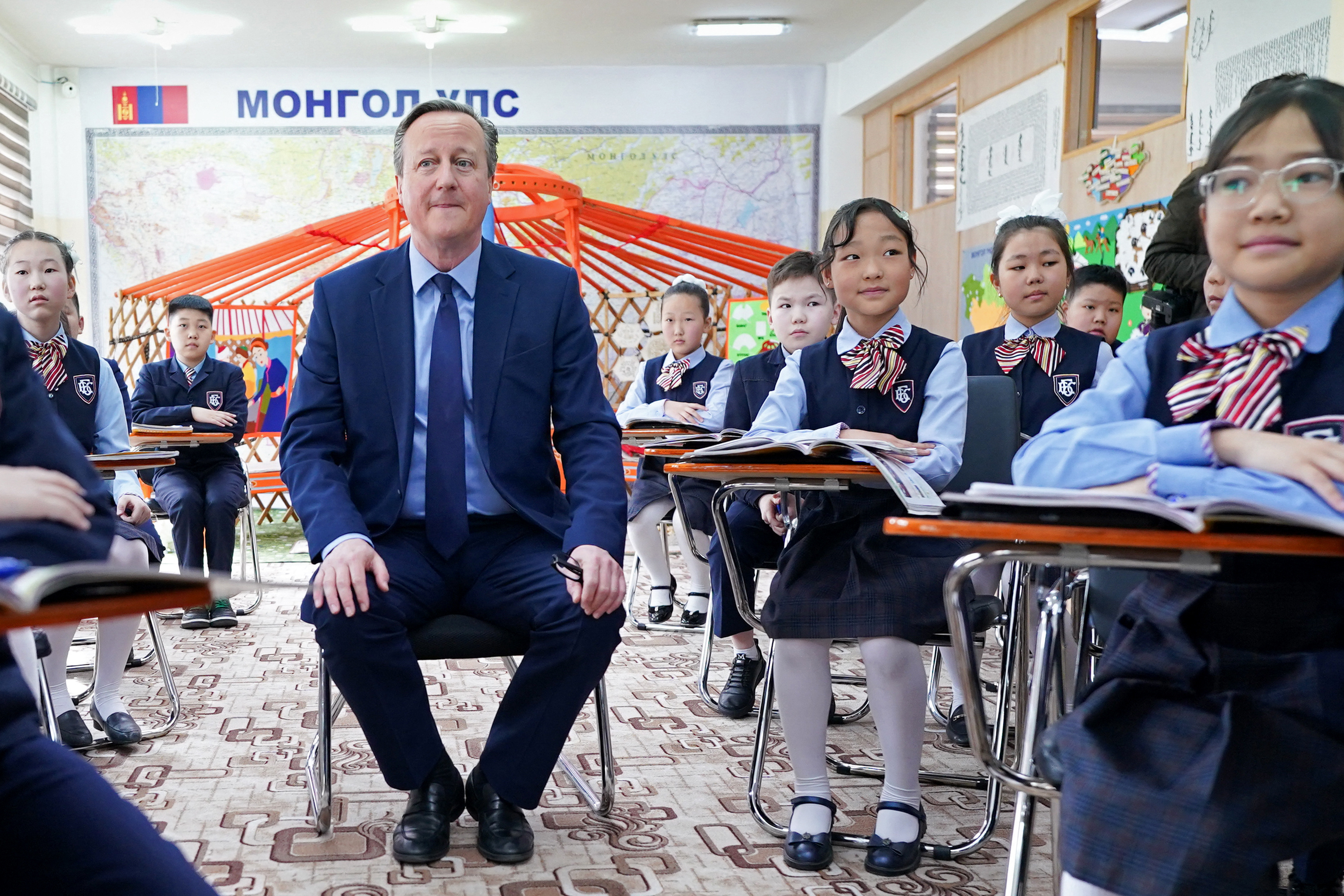 British Foreign Secretary David Cameron meets pupils and takes part in an English lesson at School No.23, during his tour of the Central Asia region, in Ulaanbaatar, Mongolia, on April 26, 2024. (Photo by Stefan Rousseau/Pool via Reuters)
