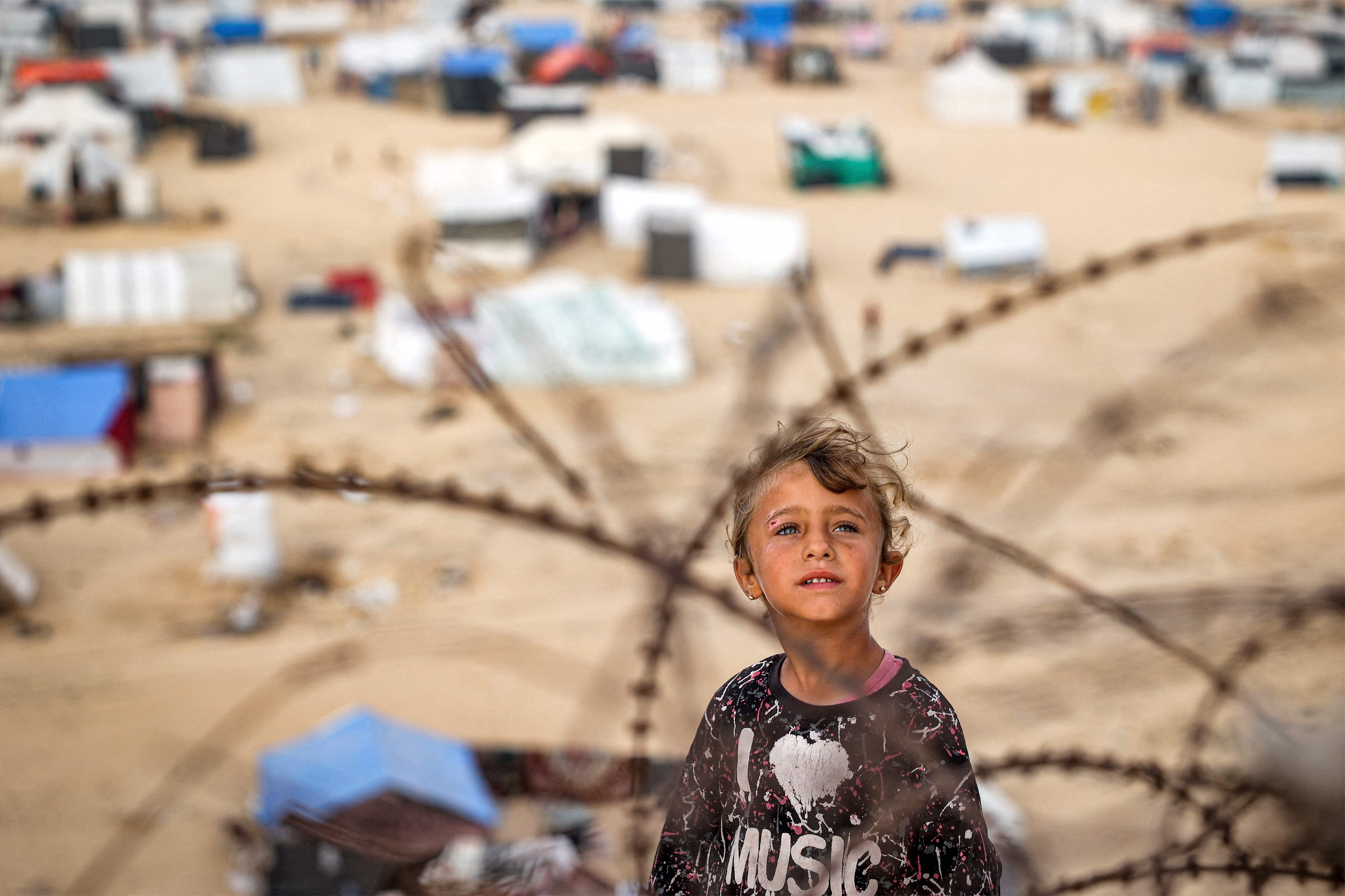 A child stands behind barbed-wire along a slope near a camp housing displaced Palestinians in Rafah in the southern Gaza Strip on April 30, 2024, amid the ongoing conflict in the Palestinian territory between Israel and the militant group Hamas. (Photo by AFP Photo/Stringer)