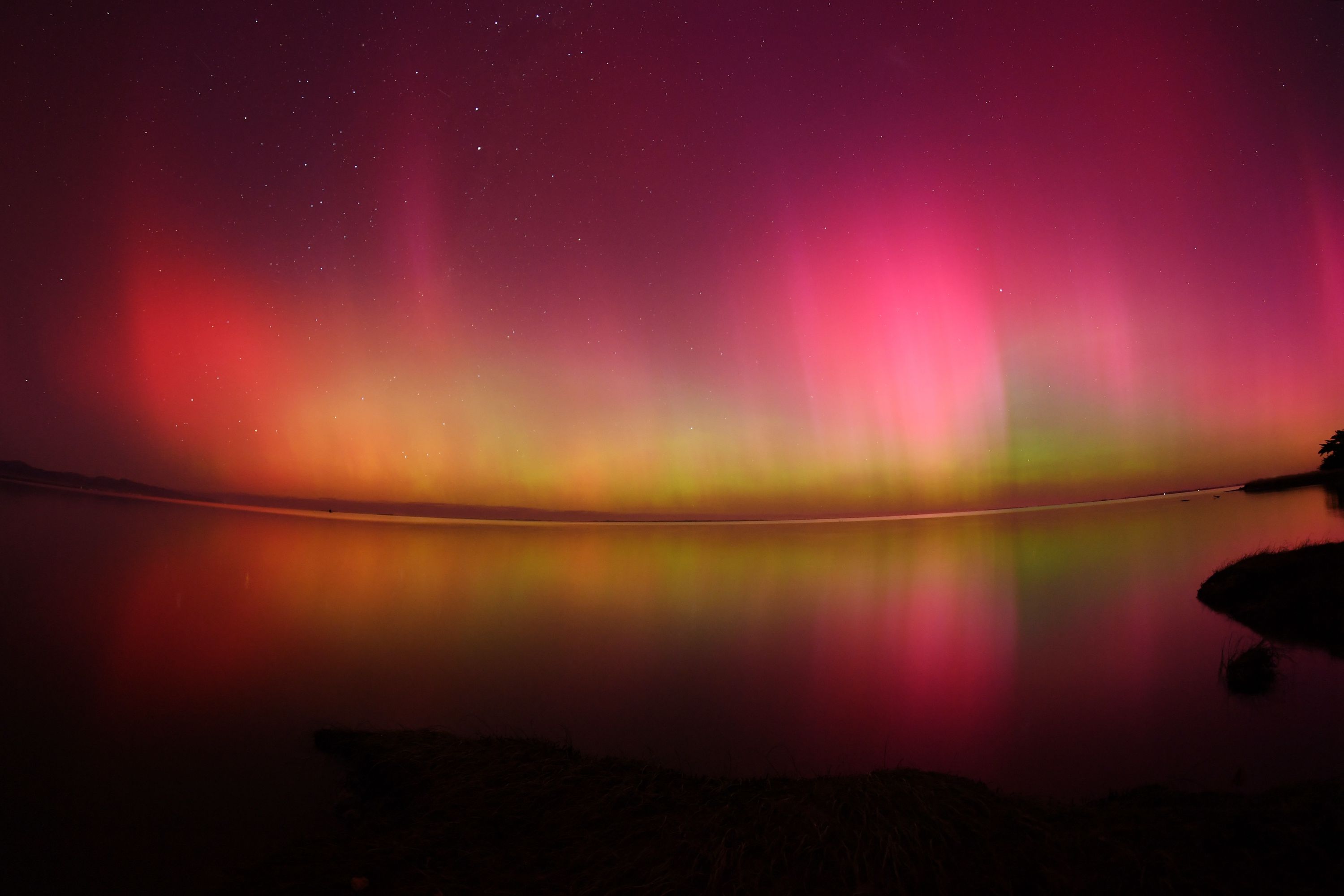 The Aurora Australis, also known as the Southern Lights, glow on the horizon over waters of Lake Ellesmere on the outskirts of Christchurch on May 11, 2024. (Photo by Sanka Vidanagama/AFP Photo)