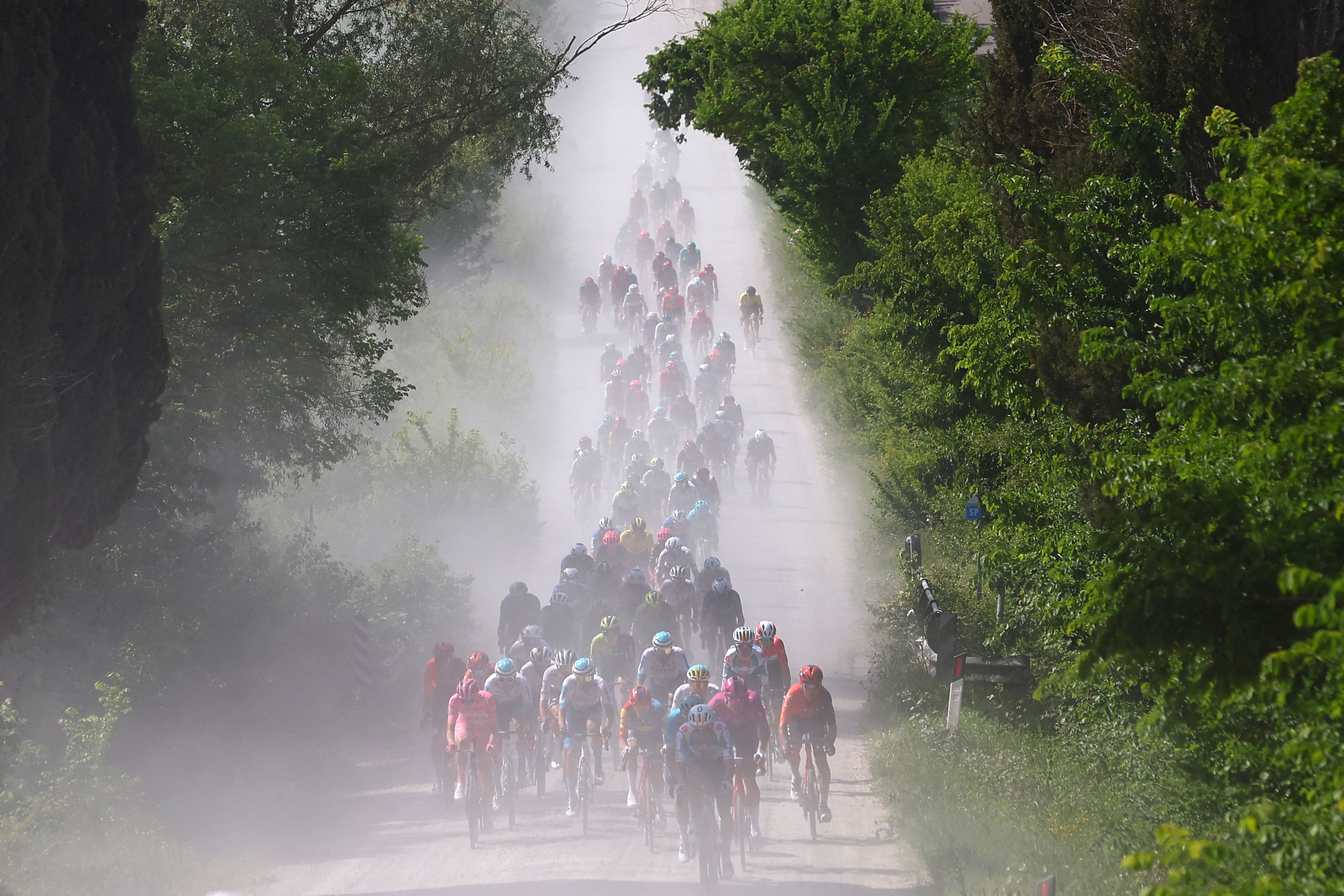 The pack rides on white roads of Tuscany during the 6th stage of the 107th Giro d'Italia cycling race, 180 km between Torre del lago Puccini and Rapolano Terme, on May 9, 2024. (Photo by Luca Bettini/AFP Photo)