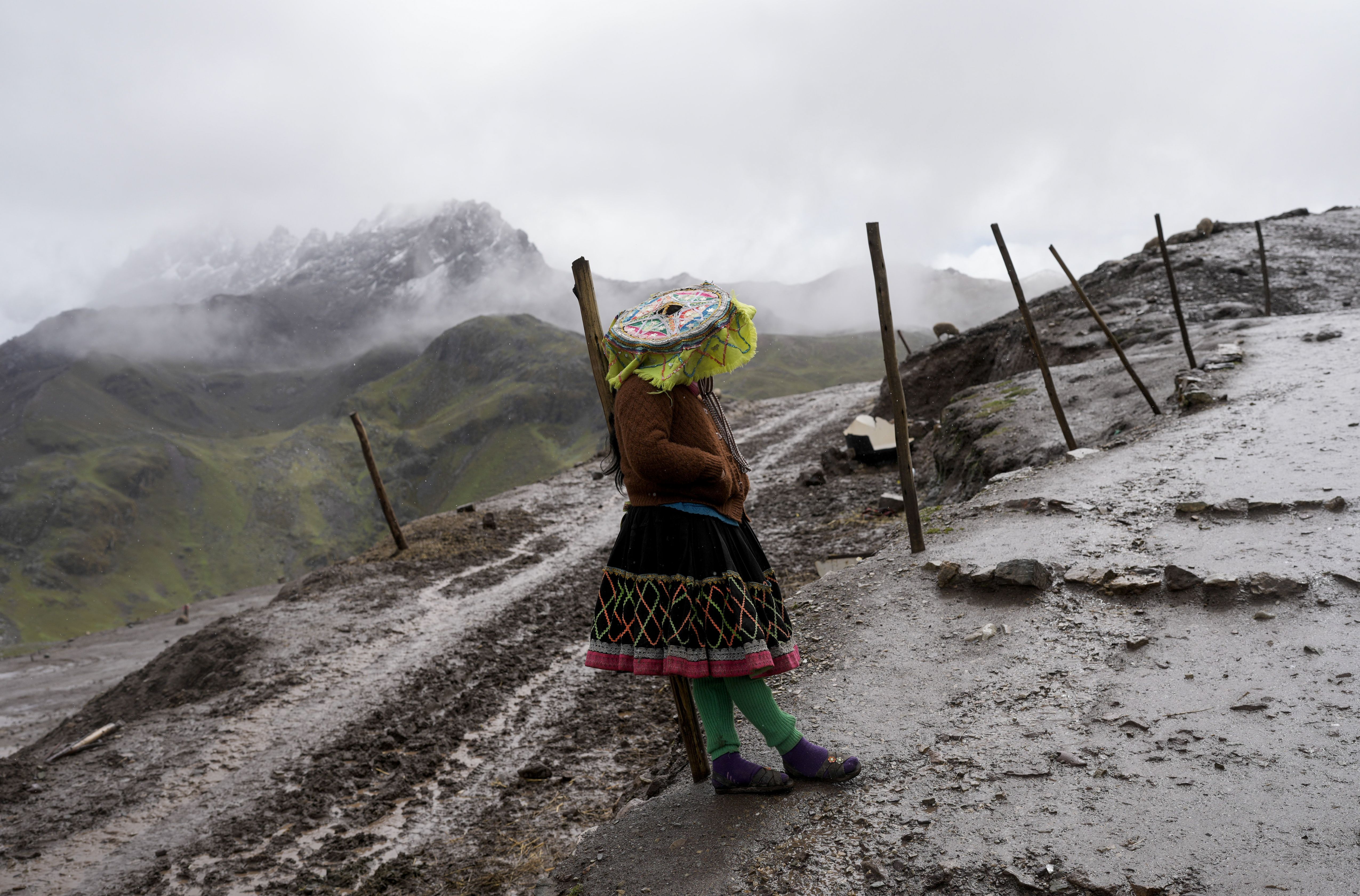 An Aymara woman waits for tourists at Rainbow Mountain, also known as Siete Colores and Vinicunca, in Cusipata, Peru, February 5, 2023. The mountain is a bustling destination for international tourists but the number of visitors has fallen due to the political unrest following President Pedro Castillo's impeachment and arrest for trying to dissolve Congress in December. (Photo by Rodrigo Abd/AP Photo)