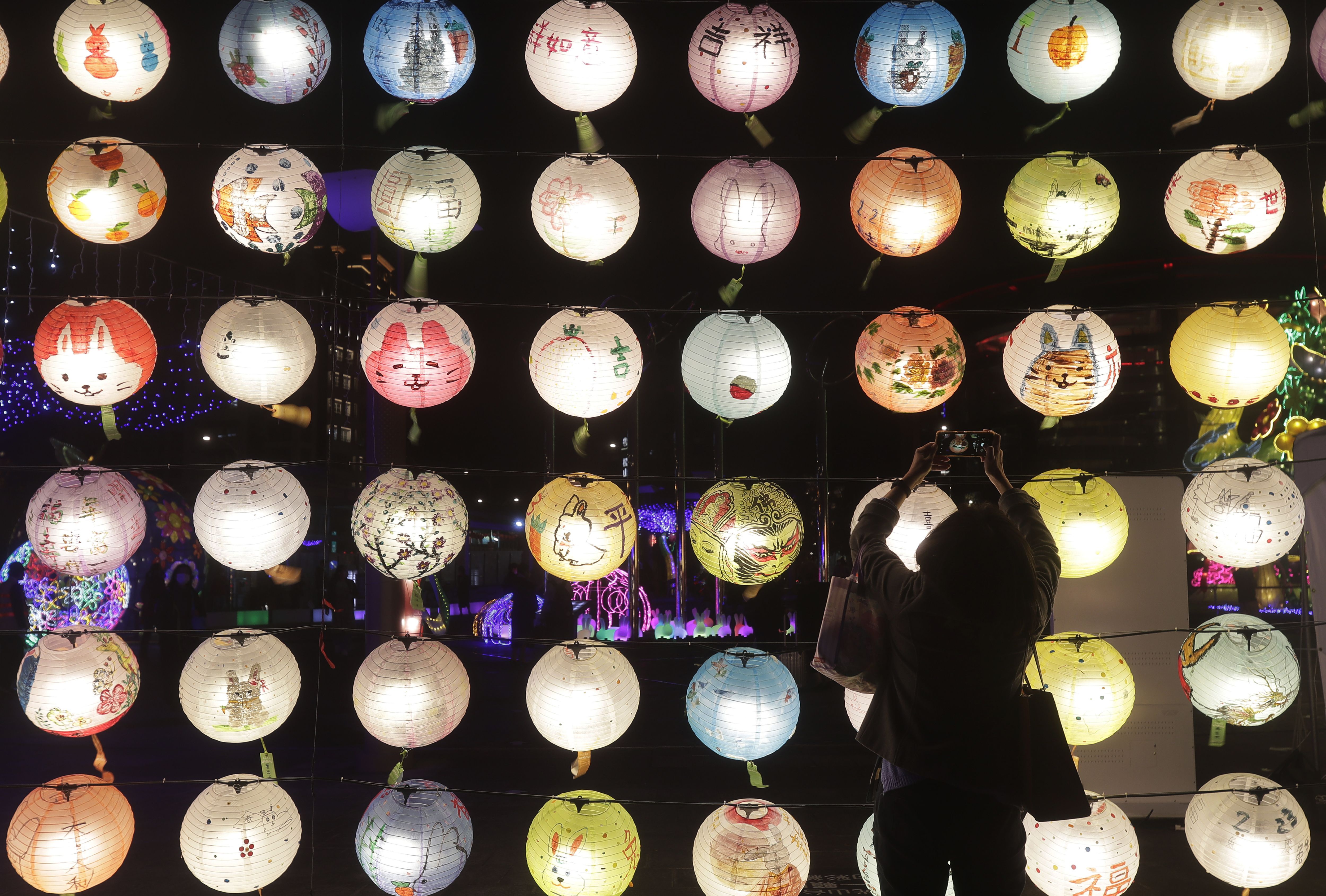 A woman takes photos with lanterns during the Lantern Festival, marking the end of the Chinese lunar New Year celebrations, in Taipei, Taiwan, Monday, February 13, 2023,. (Photo by Chiang Ying-ying/AP Photo)