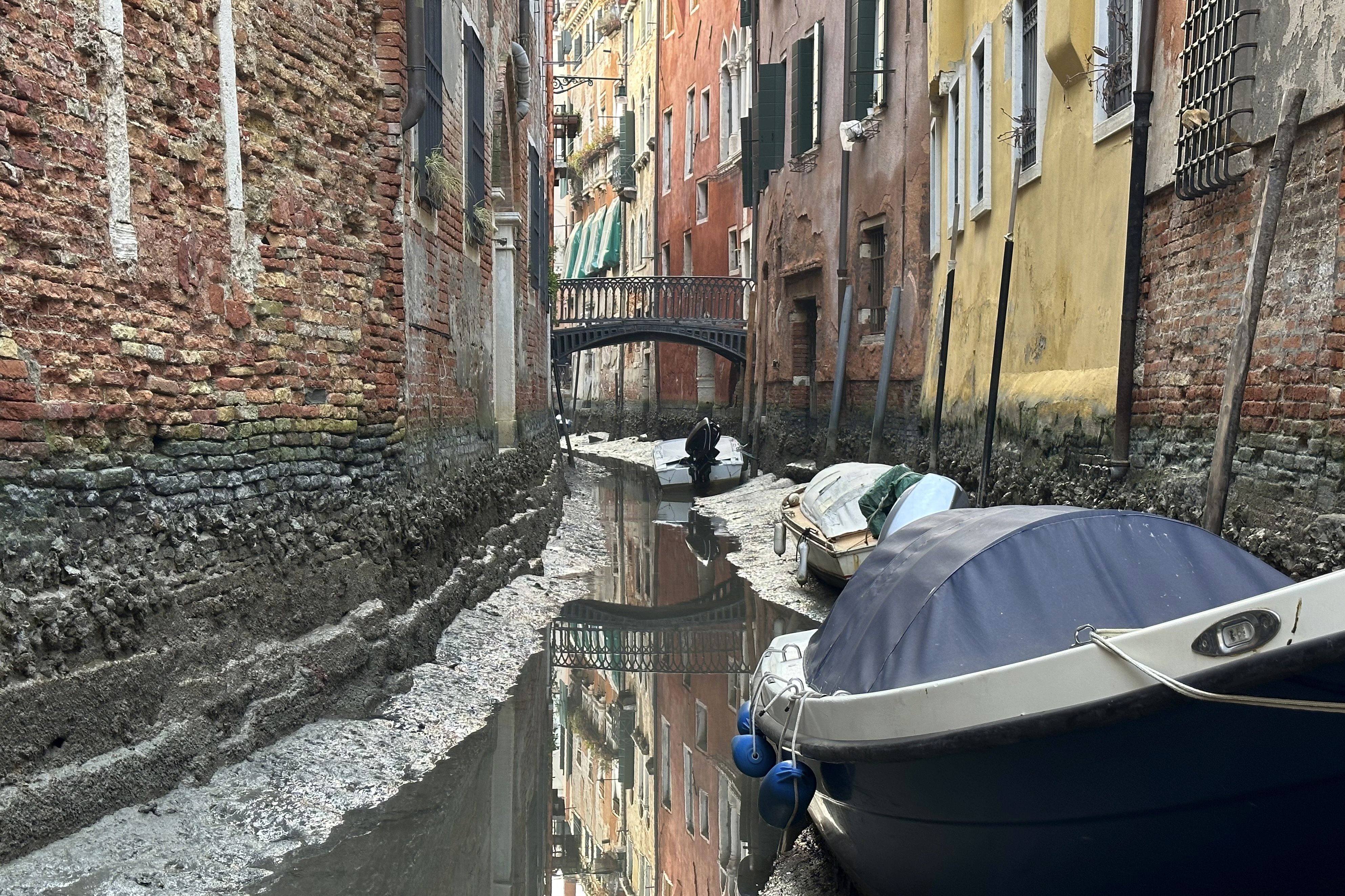 Boats are docked along a canal during a low tide in Venice, Italy, Monday, February 20, 2023. Some of Venice's secondary canals have practically dried up lately due a prolonged spell of low tides linked to a lingering high-pressure weather system. (Photo by Luigi Costantini/AP Photo)
