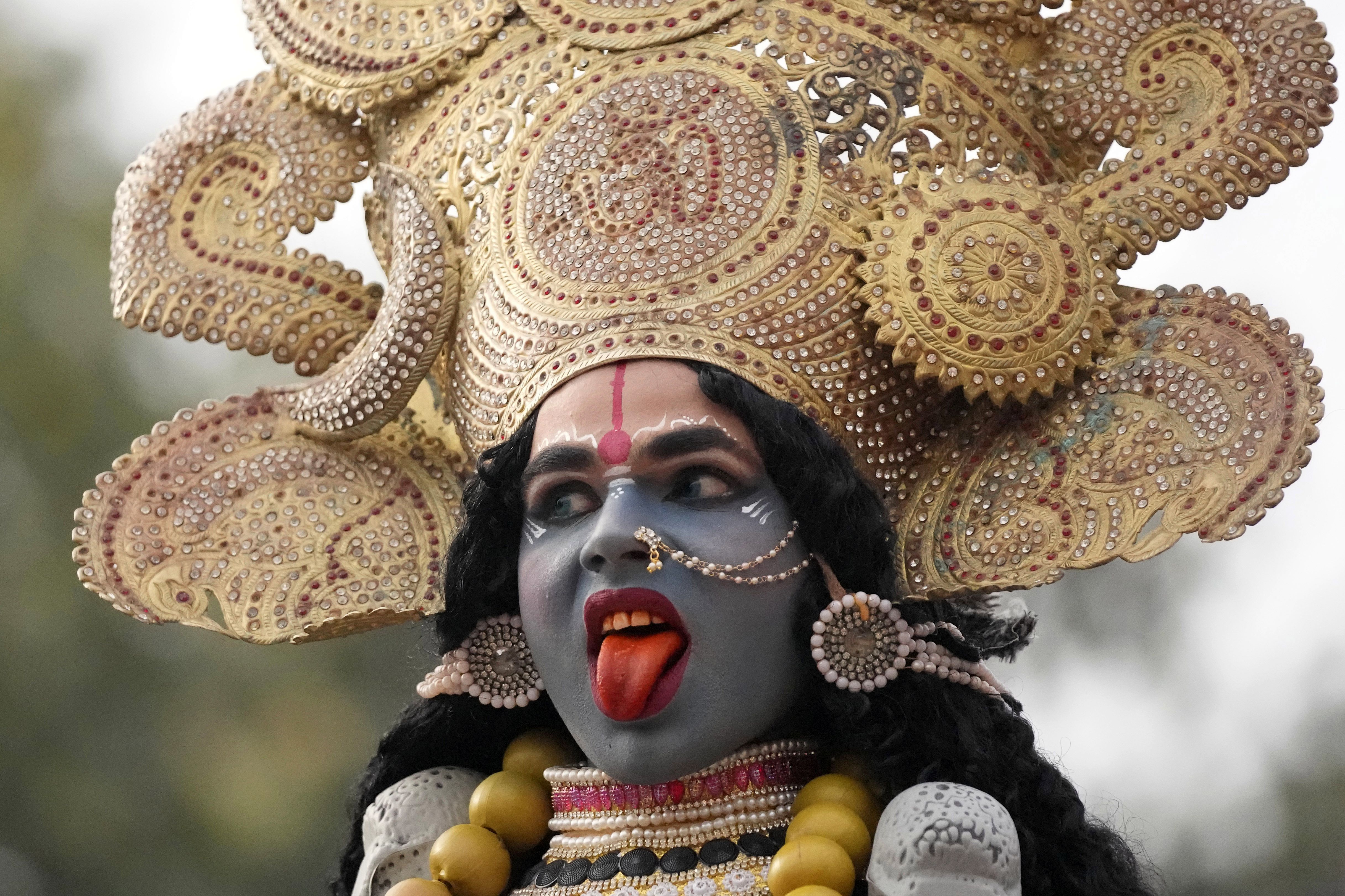A devotee dressed as Hindu goddess Kali participates in a procession on the eve of Shivratri festival in Jammu, India, Friday, February 17, 2023. The festival dedicated to the worship of Shiva, will be marked across the country on Saturday. (Photo by Channi Anand/AP Photo)