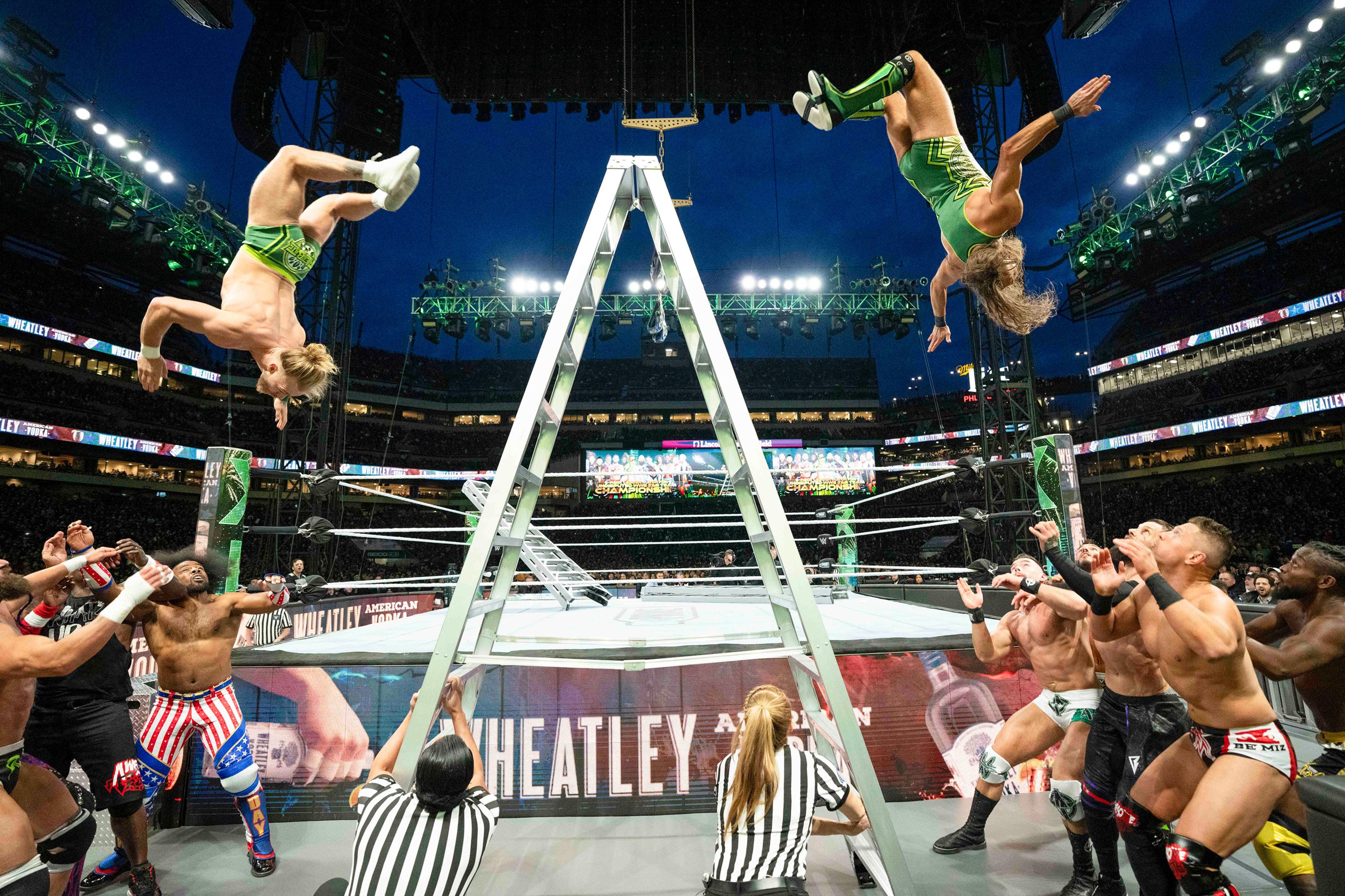 Tyler Bate and Pete Dunne In Action during the 6-Pack Ladder Match on Night One WrestleMania 40 at Lincoln Financial Field on April 6, 2024 in Philadelphia, Pennsylvania. (Photo by WWE/Getty Images)