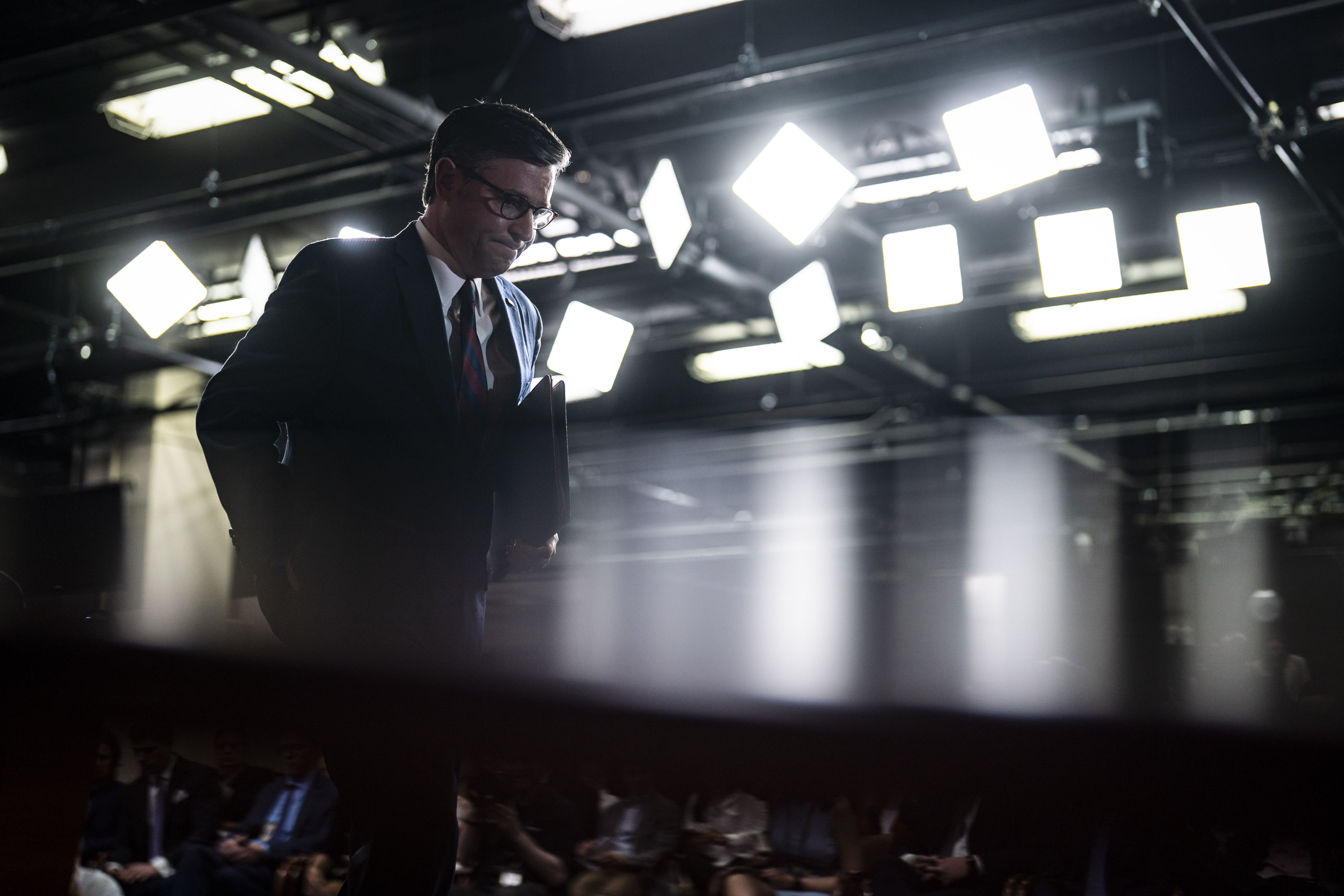 Speaker of the House Mike Johnson, R-La., departs after speaking at a press conference following a closed-door meeting with fellow Republicans on Capitol Hill in Washington, DC on Tuesday, May 07, 2024. (Photo by Jabin Botsford/The Washington Post)
