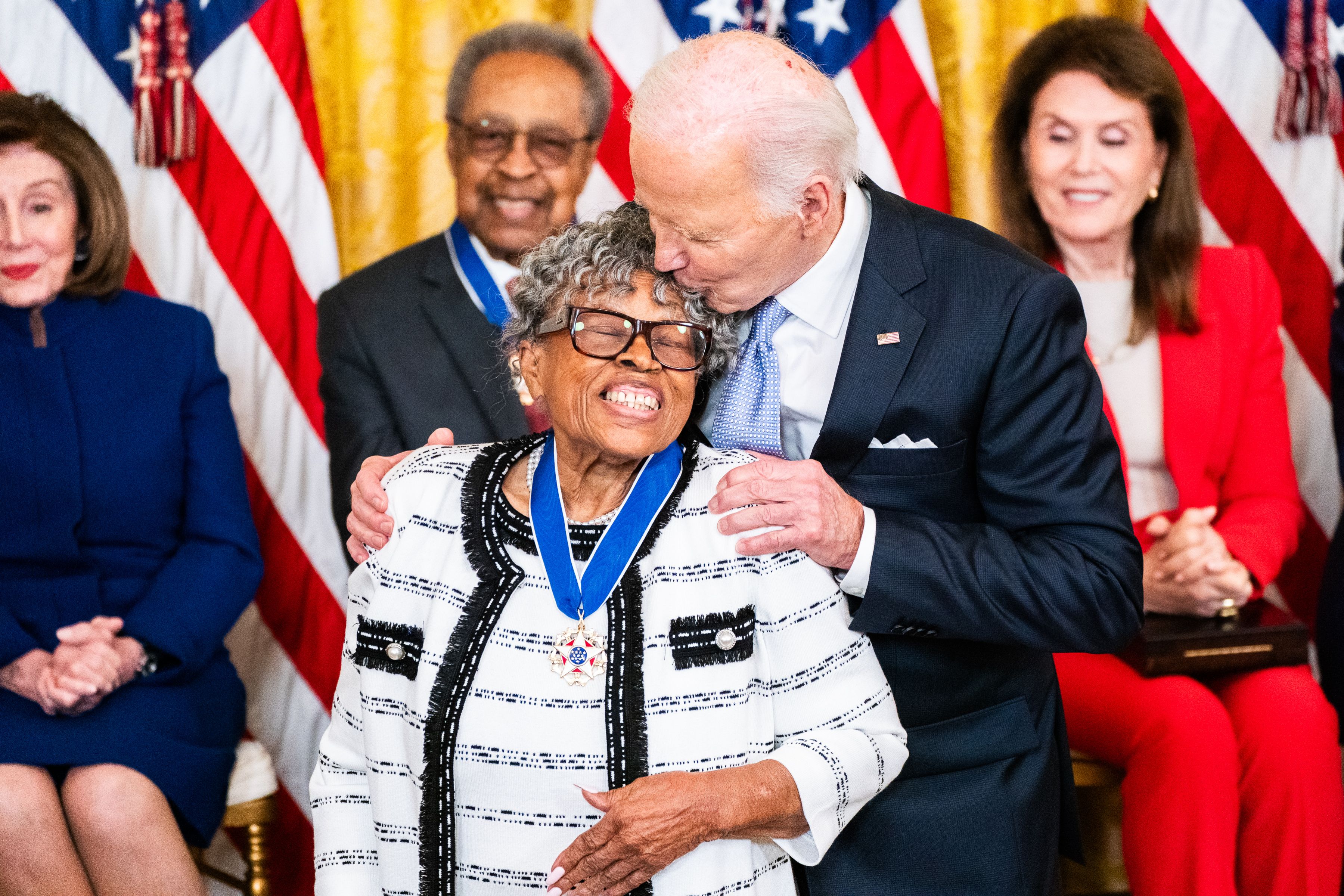 Opal Lee and US President Joe Biden during the presentation of the Presidential Medal of Freedom in the East Room of the White House on Friday May 3, 2024. Bonnie S. Englebardt accepted the award on behalf of Frank Lautenberg. (Photo by Demetrius Freeman/The Washington Post)