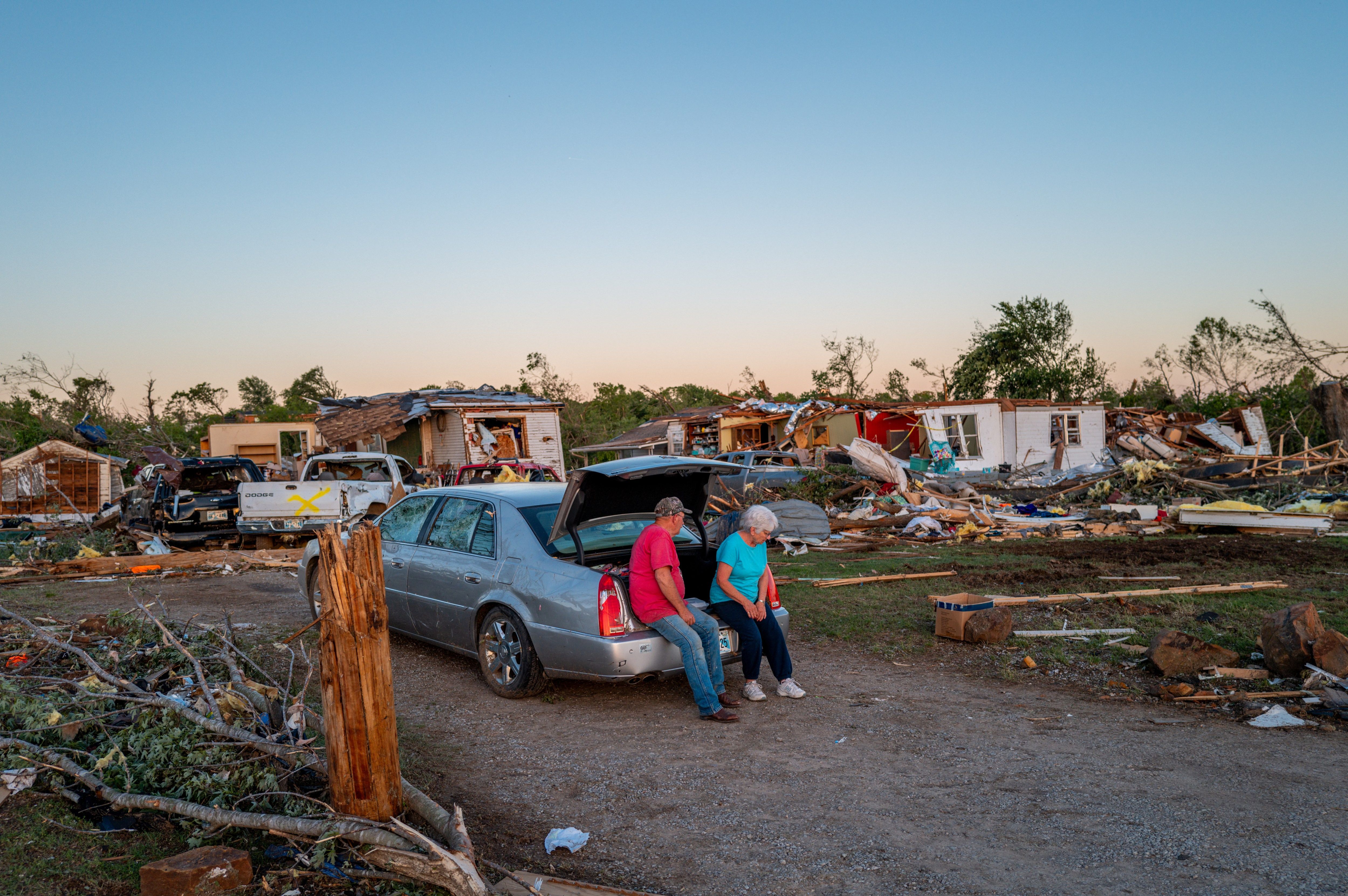 The Millers sit together in the trunk of their car amid their neighborhood levelled by a tornado on May 07, 2024 in Barnsdall, northeast Oklahoma. The EF3 twister that struck claimed one life and destroyed dozens of homes in the community of just over 1,000 people. (Photo by Brandon Bell/Getty Images)