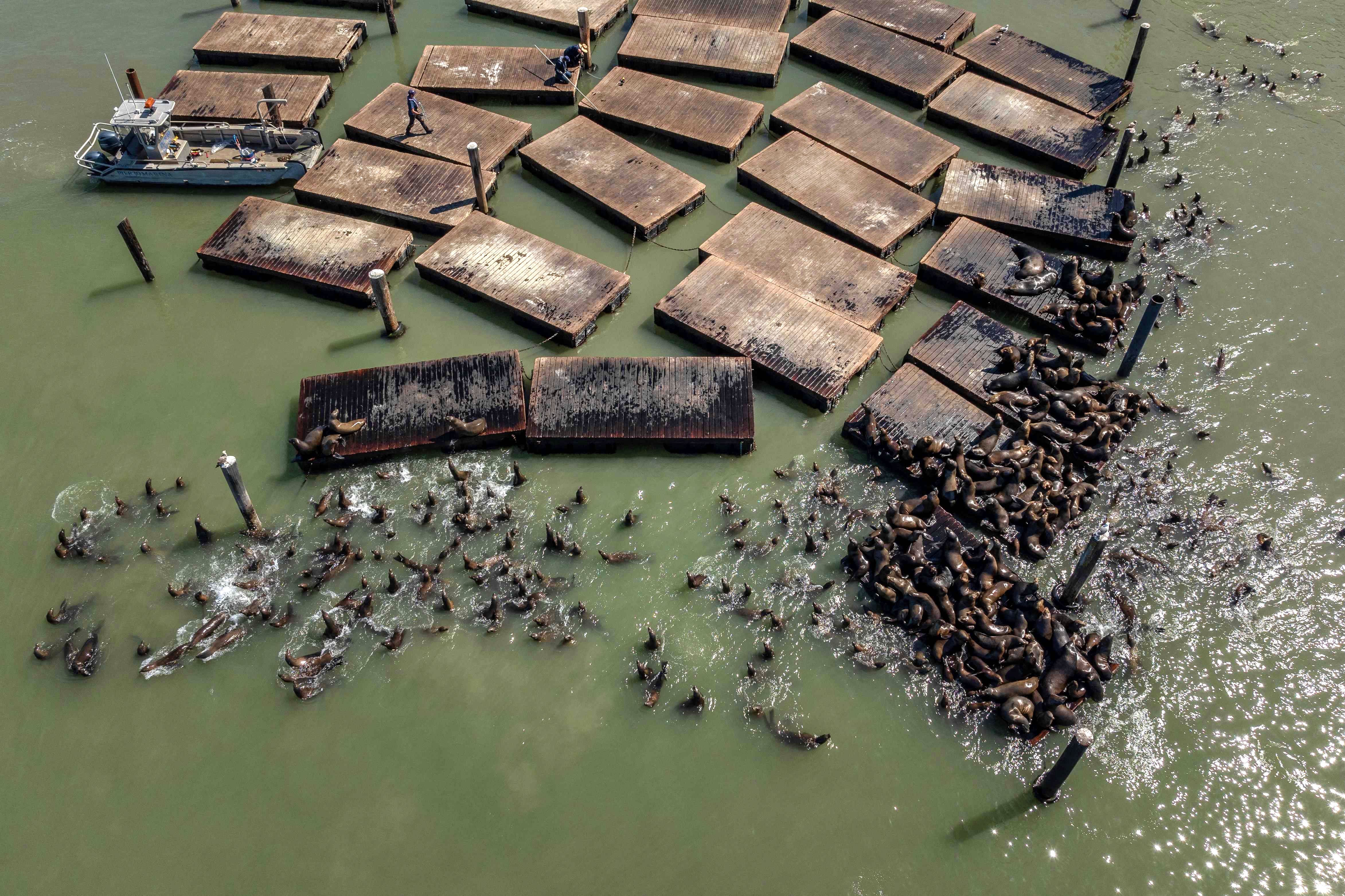 This aerial view shows California sea lions congregating at Pier 39 on May 7, 2024 in San Francisco, California. A recent surge in the number of sea lions at this popular tourist destination has resulted from large schools of anchovies and herring in the bay waters for them to feed on before the approaching mating season. (Photo by Loren Elliott/AFP Photo)
