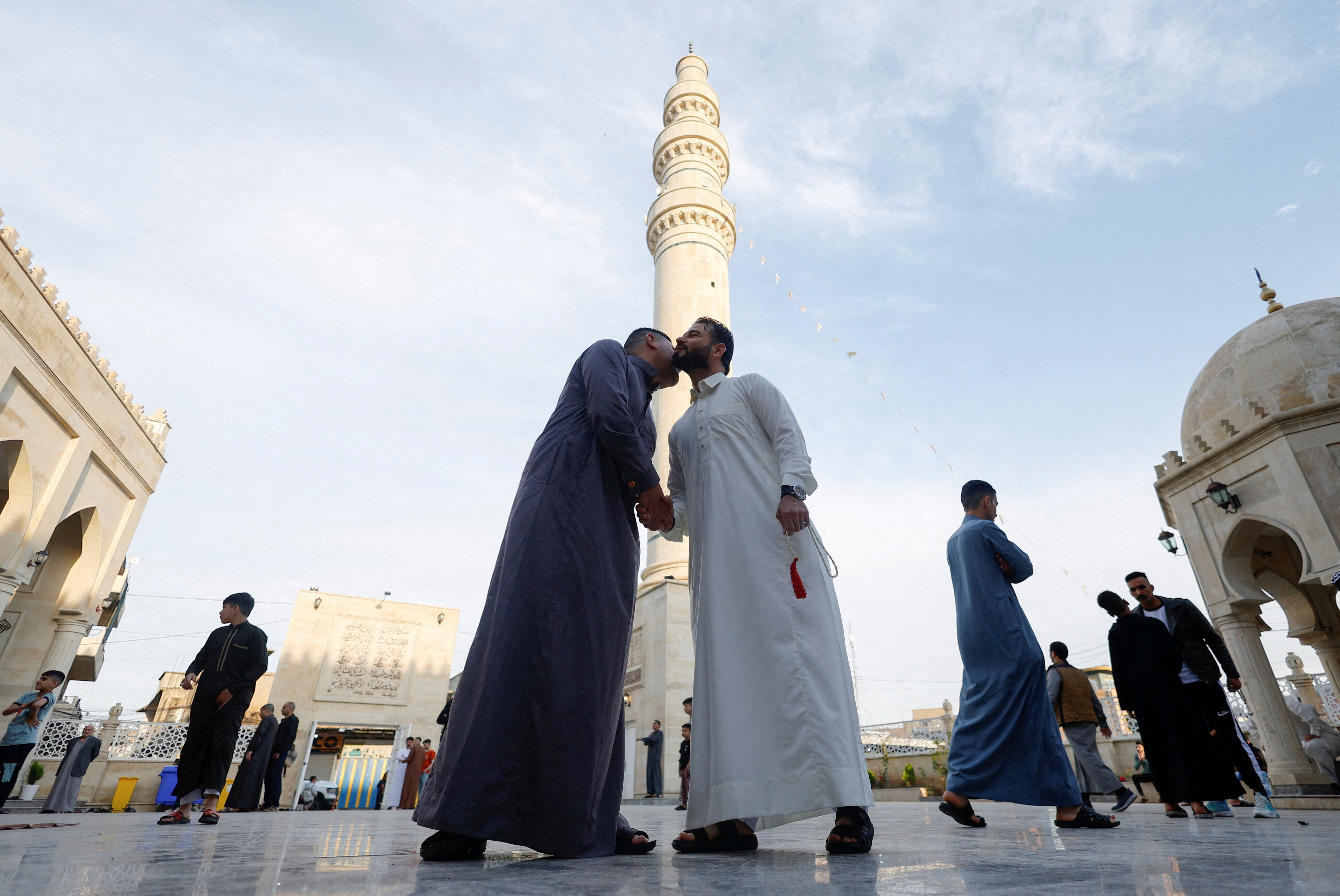 Sunni worshippers exchange greetings after Eid al-Fitr prayers to mark the end of the fasting month of Ramadan in Mosul, Iraq on April 10, 2024. (Photo by Khalid Al-Mousily/Reuters)