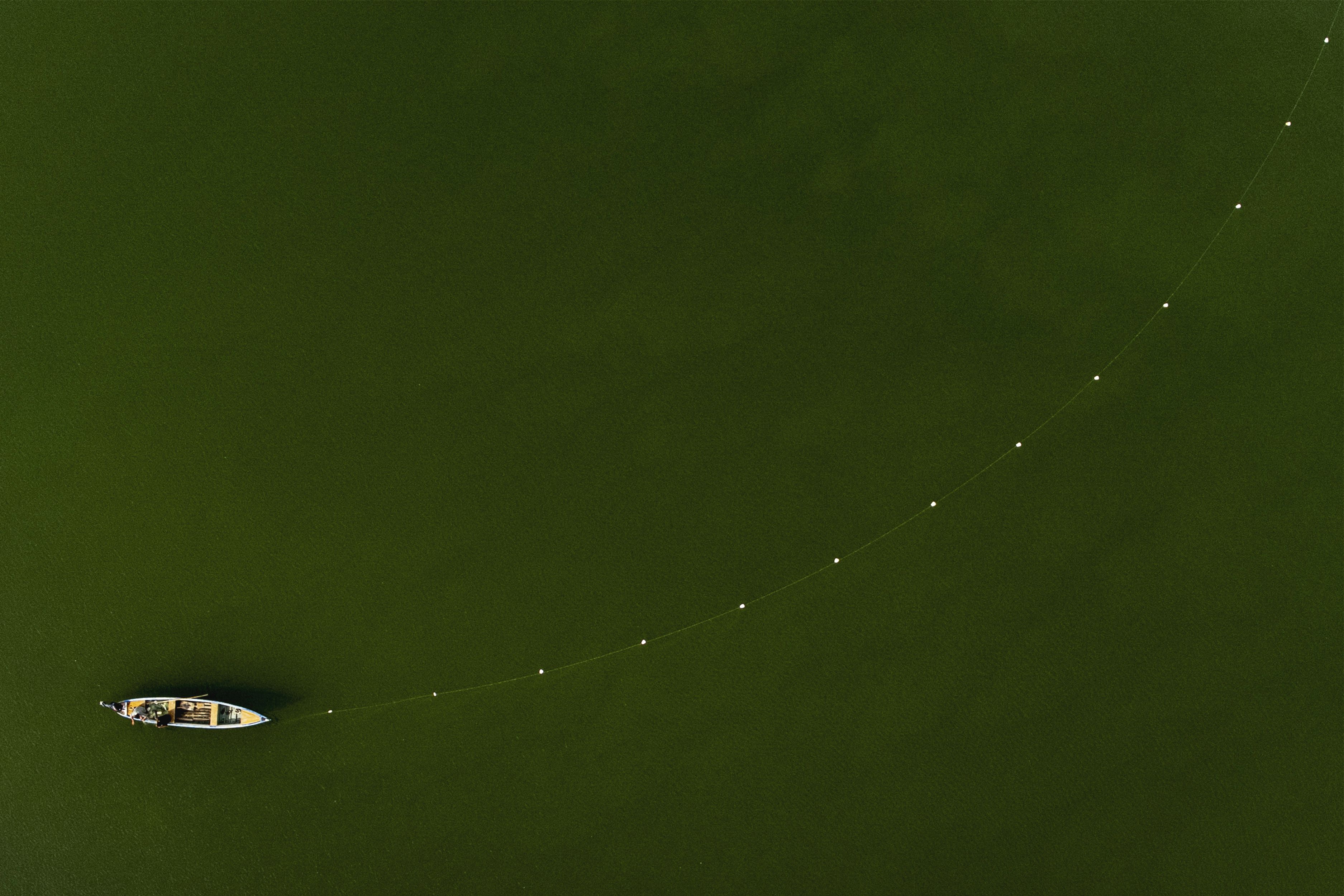 This aerial view shows a fisherman sitting in his boat after casting a net in the Shatt al-Arab river, formed at the confluence of the Tigris and Euphrates rivers, in Iraq's southern city of Basra on April 15, 2024. (Photo by Hussein Faleh/AFP Photo)