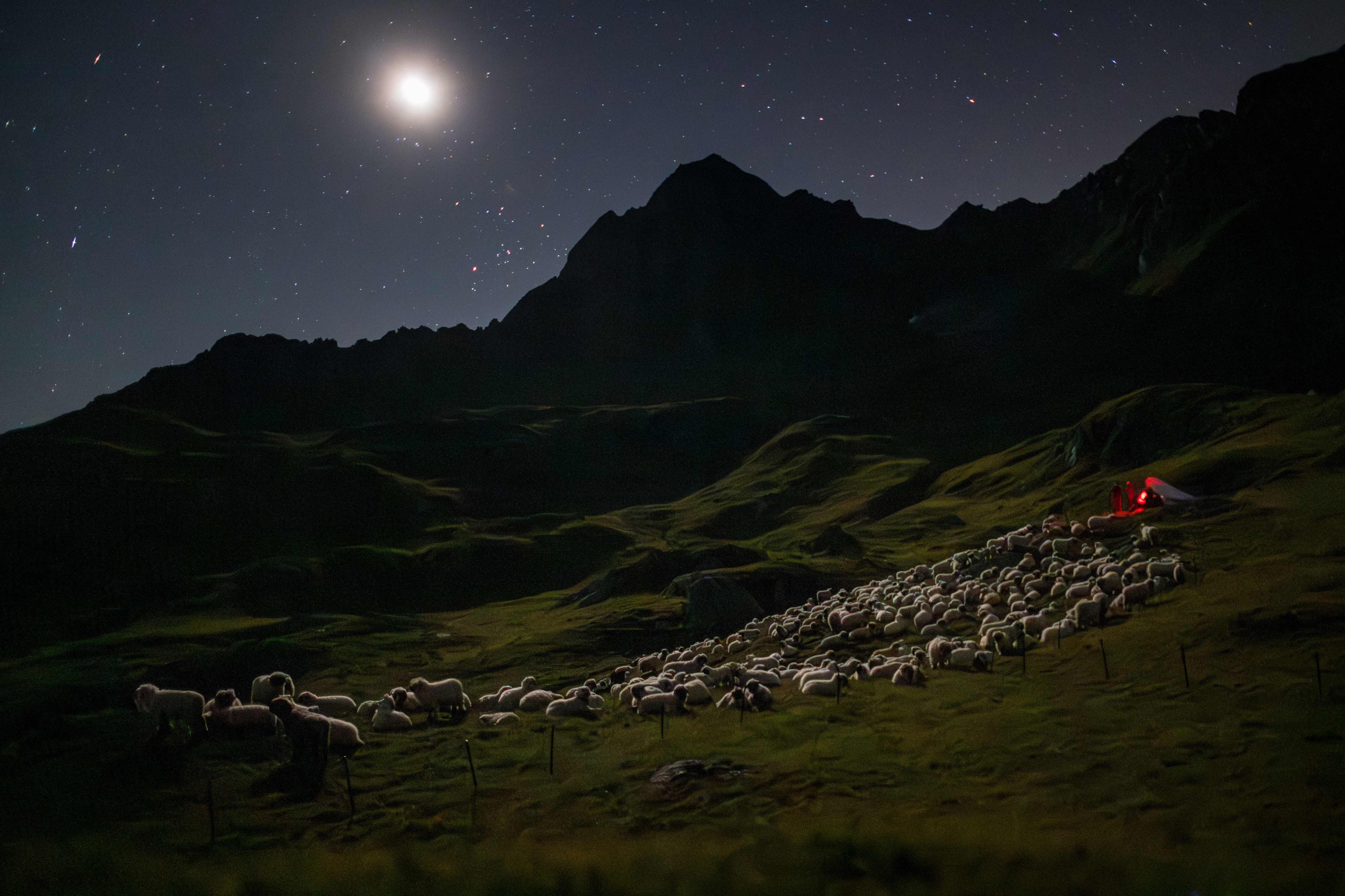 This photograph shows sheeps under the moon in Pontimia Pasture in the Swiss Alps during a monitoring programme by Swiss NGO “OPPAL” to watch livestock against wolf, on early August 10, 2023. If the predator were to get past the electric wires stretched around this high-altitude pasture in the Swiss Alps, Aliki Buhayer-Mach knows “it would be a massacre”. She and her 60-year-old husband Francois Mach-Buhayer have settled in to spend the night watching over some 480 sheep grazing in the remote mountains near the Italian border. (Photo by Fabrice Coffrini/AFP Photo)