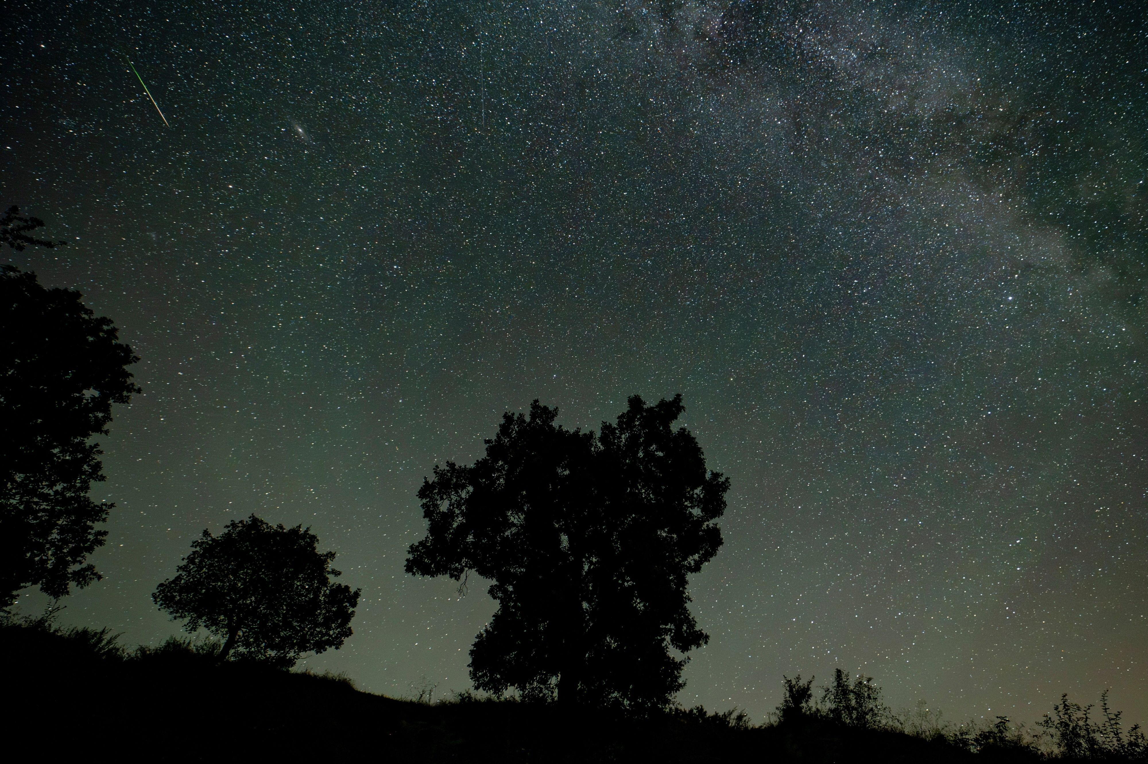 In this photo taken with long shutter speed, a shooting star is seen during the Perseids meteor shower above Holloko, Hungary, early Sunday, August 13, 2023. The Perseid meteor shower occurs every year in August when the Earth passes through debris and dust of the Swift-Tuttle comet. (Photo by Peter Komka/MTI via AP Photo)