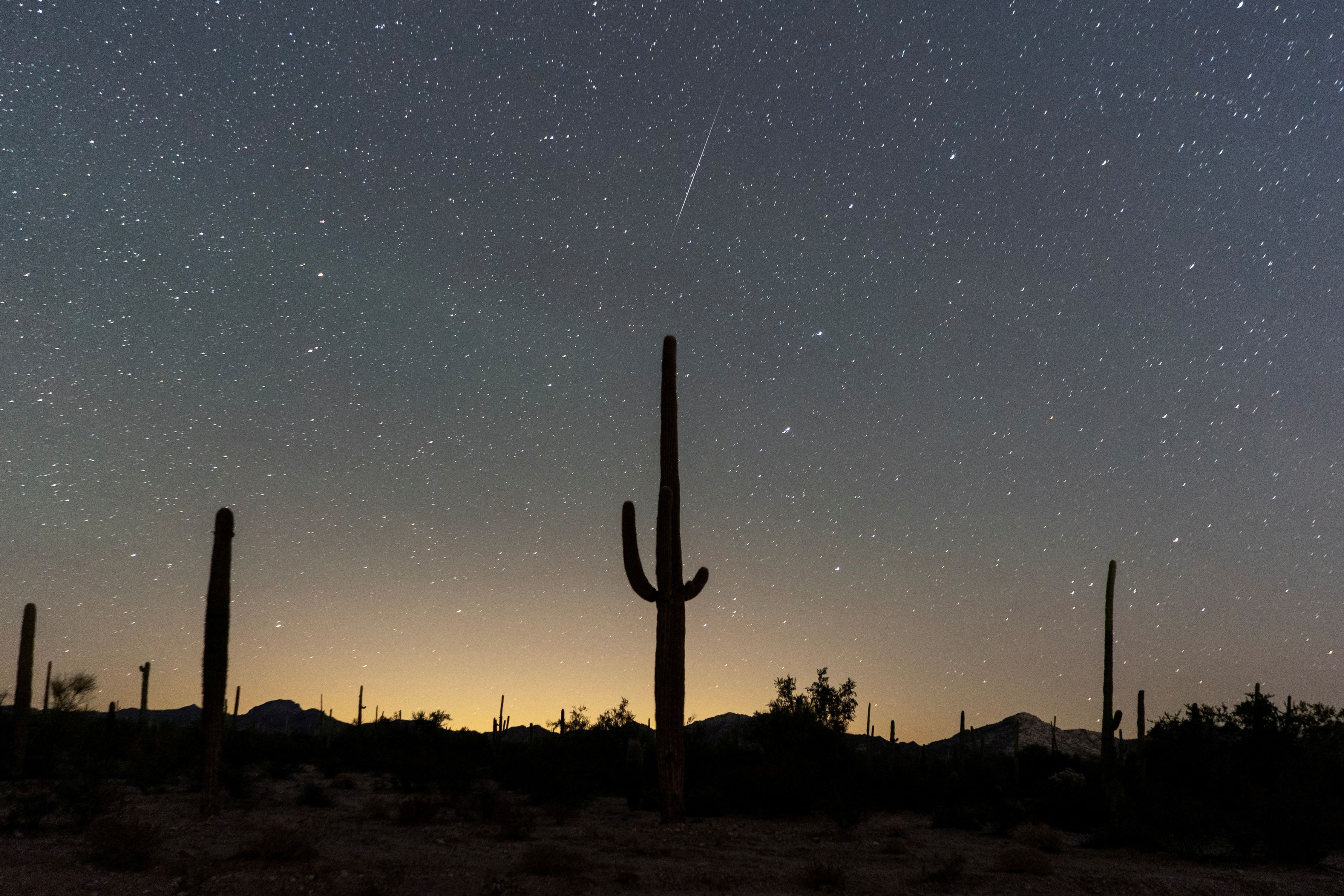 A meteor streaks in the night sky over a cactus during the annual Geminids meteor shower near the U.S.-Mexico border town of Lukeville, Arizona on December 14, 2023. (Photo by Go Nakamura/Reuters)