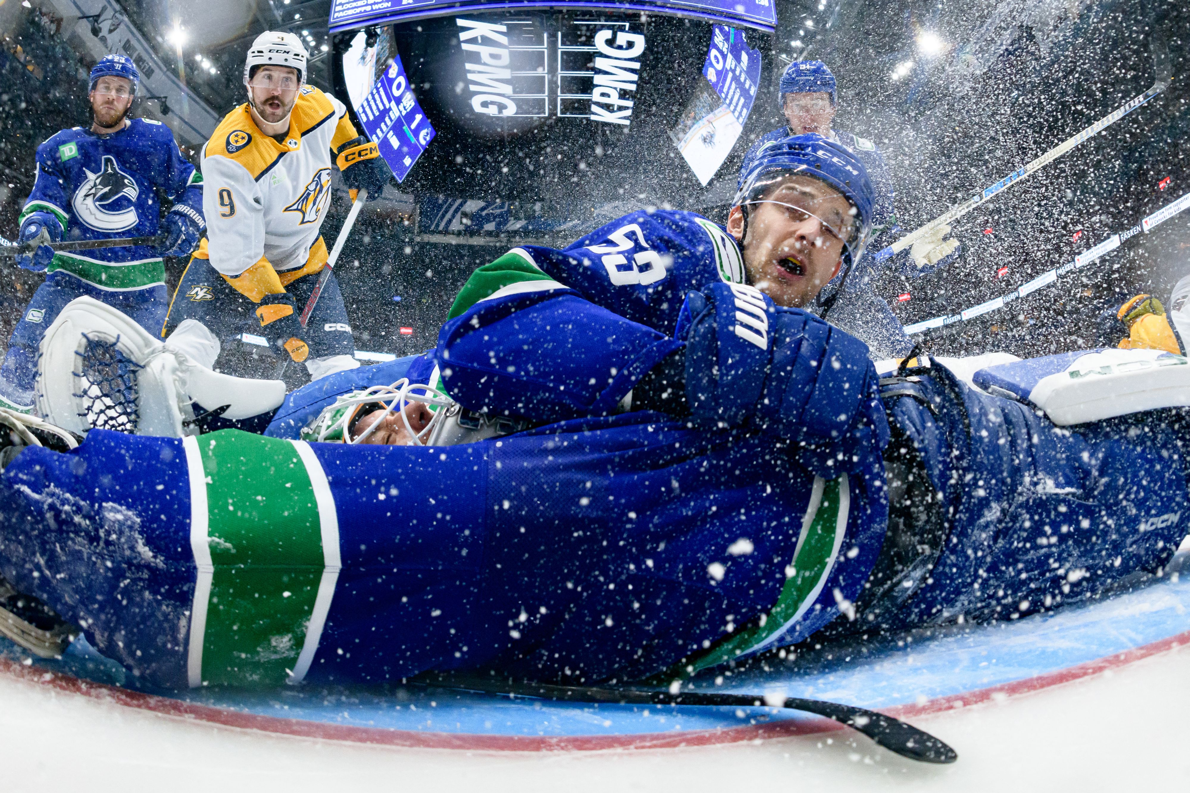 Filip Forsberg #9 of the Nashville Predators Arturs Silovs #31 Teddy Blueger #53 Nikita Zadorov #91 and Elias Lindholm #23 of the Vancouver Canucks look on after a goal by Roman Josi #59 of the Nashville Predators during the third period in Game Five of the First Round of the 2024 Stanley Cup Playoffs at Rogers Arena on April 30, 2024 in Vancouver, British Columbia, Canada. (Photo by Derek Cain/Getty Images/AFP Photo)