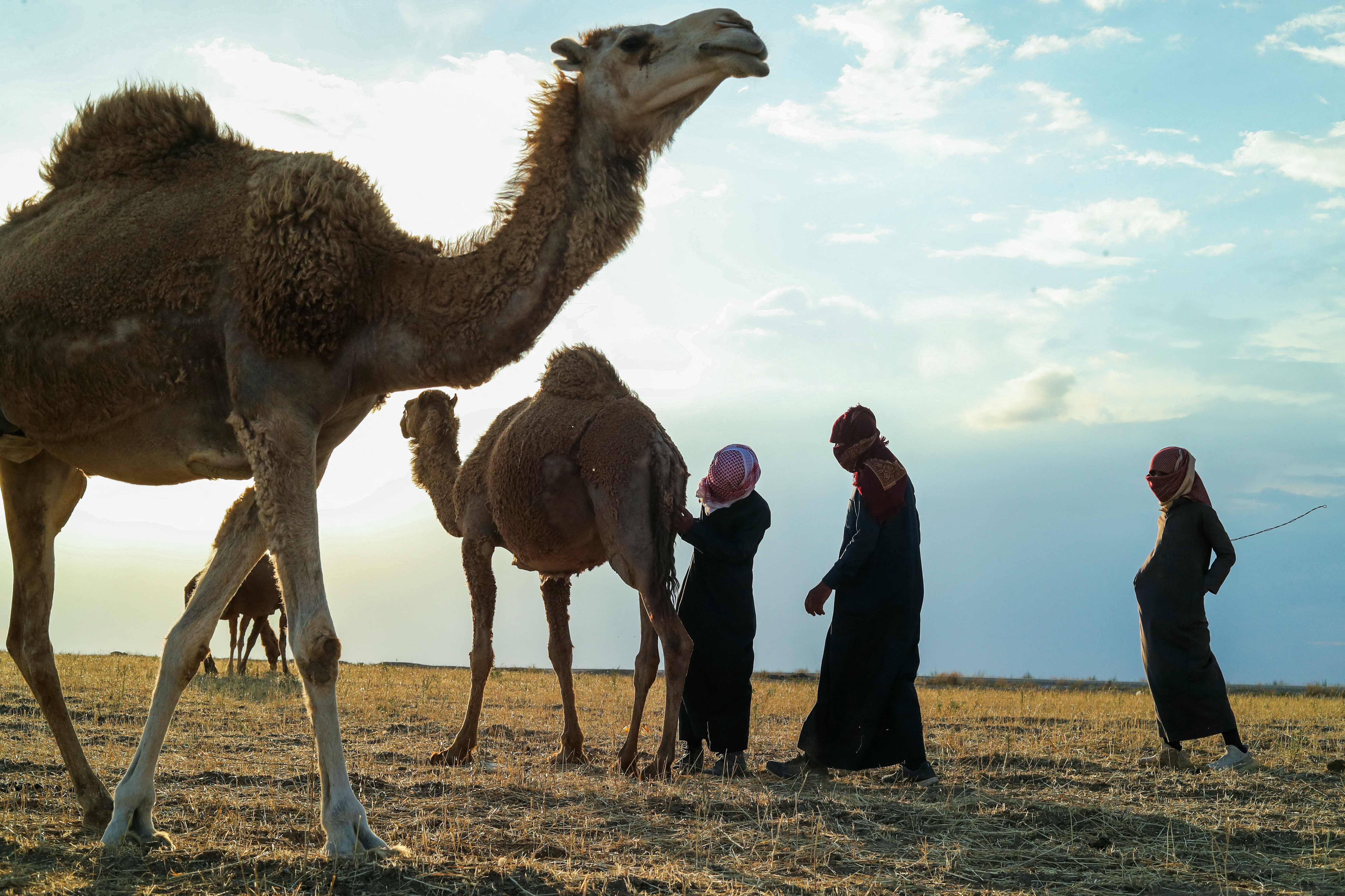 Herders tend camels at a field in Raqa on May 13, 2024. (Photo by Delil Souleiman/AFP Photo)