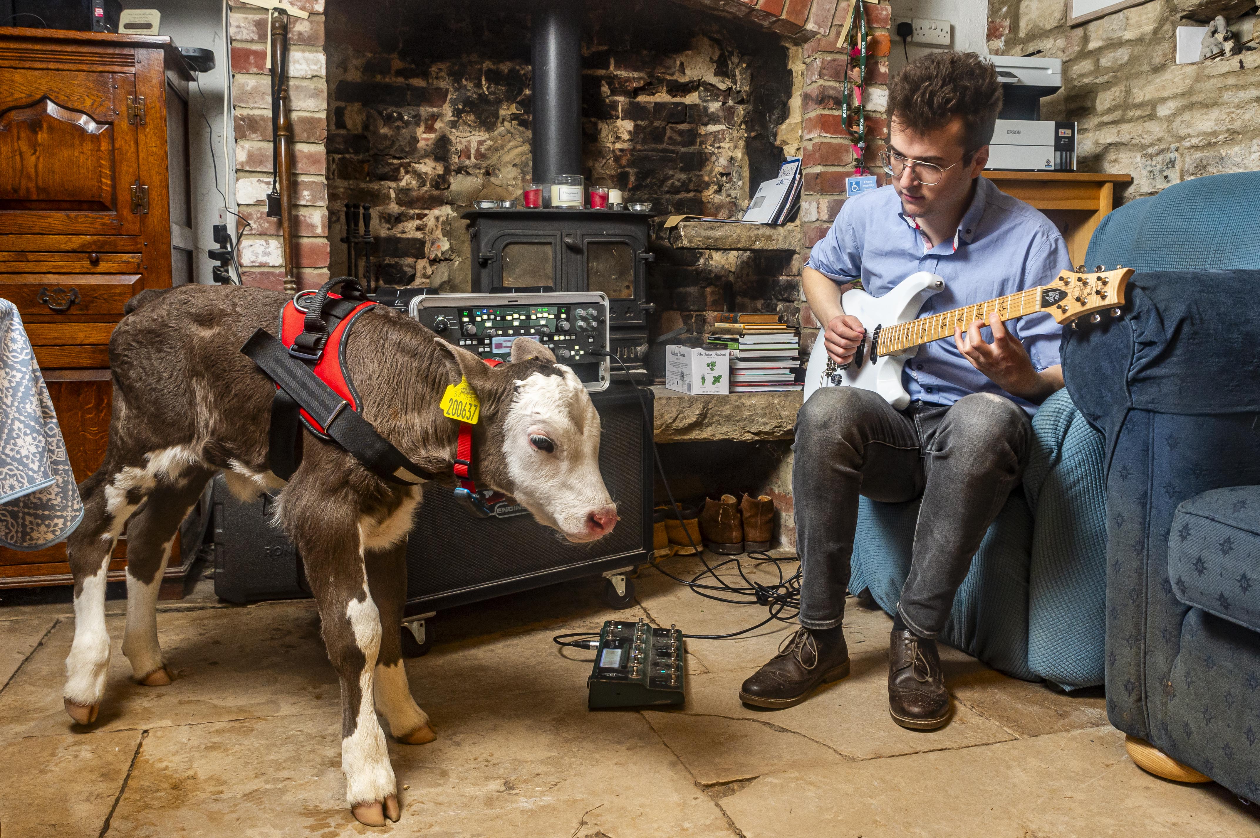 Silvio listening to Ben practice guitar in the living room in May 2024. A confused orphaned calf who is being hand-reared by a farmer appears to think he is a dog. Three-week old Silvio is sharing a kennel with Welsh border collie Taffy, has a GPS collar and likes going for walks with farmer Ben Bowerman and his family. The Bowermans try to get Silvio to spend his days out in the field at the 450-acre Godlingston Manor Farm, near Swanage, Dorset, with the other cows. But when they check on the calves in the evening, he always runs back with them to the house. (Photo by Max Willcock/Bournemouth News)