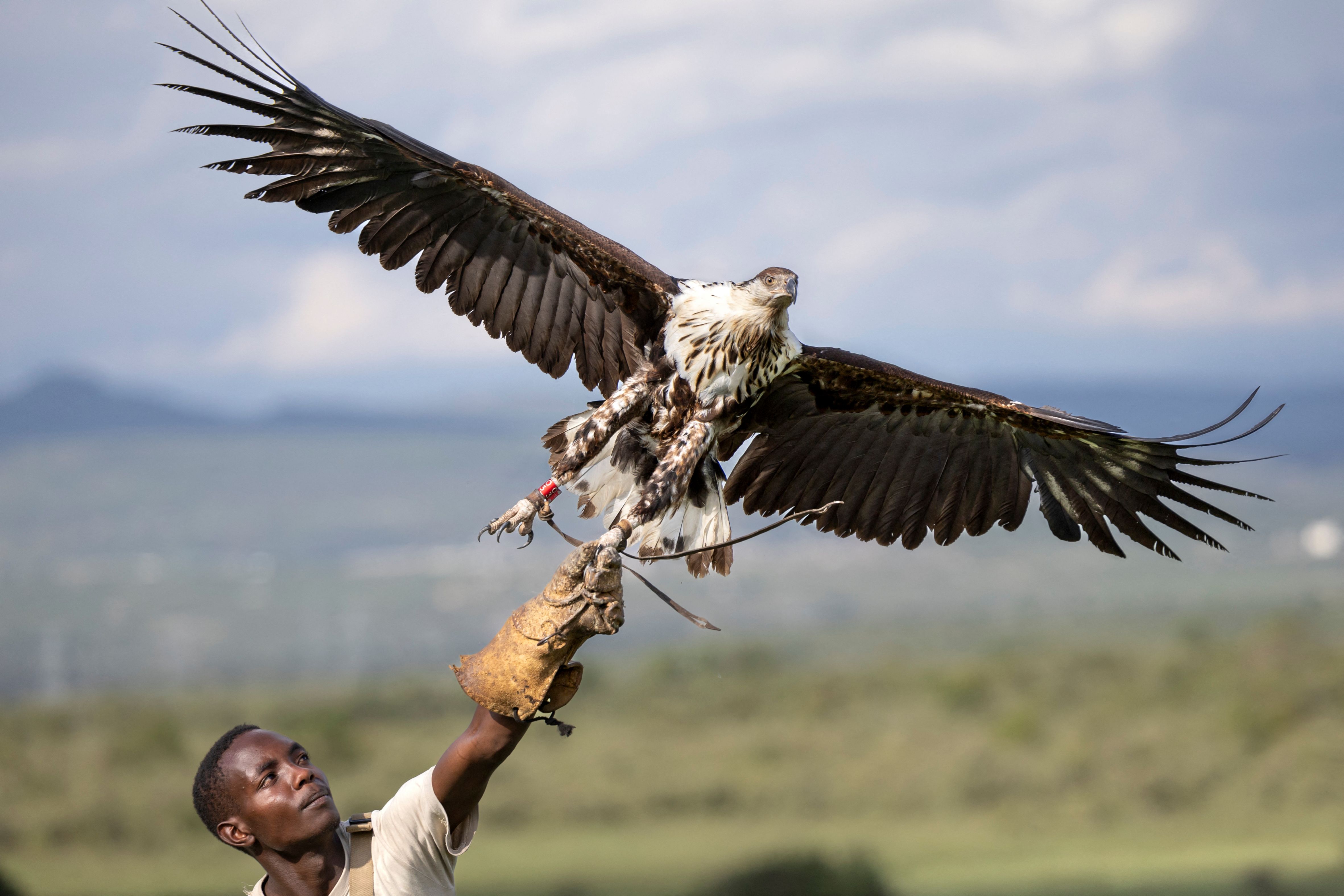 Raptor technician John Kyalo Mwanzia rehabilitates a juvenile Fish Eagle to flight after it was treated for grounding injuries sustained in a territorial fight at the Lake Naivasha habitat that's bustling with the species, at the Soysambu Raptor Centre, one of the Kenya Bird of Prey Trust's veterinary and rehabilitation facilities, in Soysambu conservancy, Nakuru on April 17, 2024. (Photo by Tony Karumba/AFP Photo)