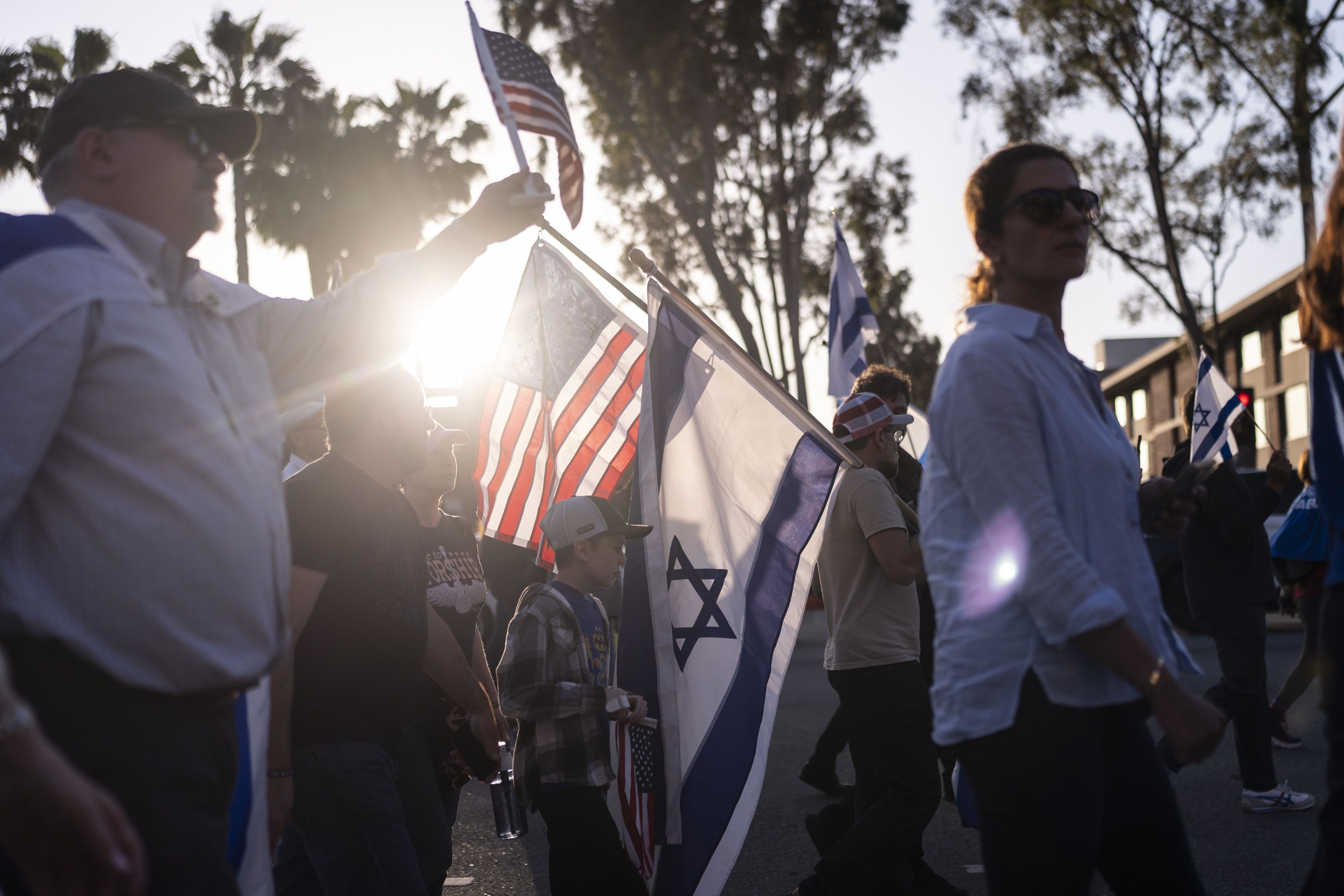 Pro-Israel supporters march outside the University of Southern California campus in Los Angeles, Wednesday, May 8, 2024. (Photo by Jae C. Hong/AP Photo)