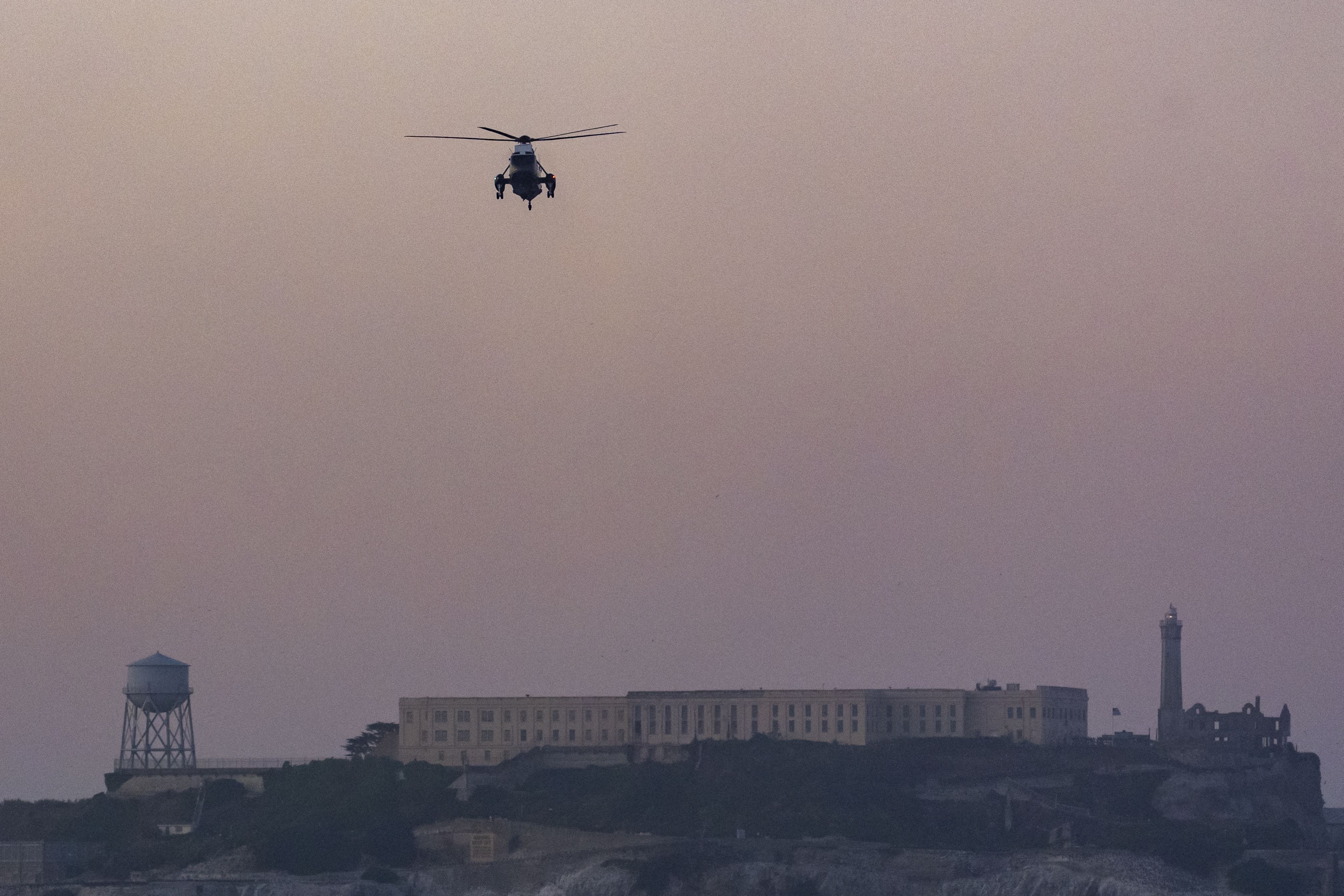 Marine One, with President Joe Biden aboard, flies over Alcatraz Island on approach for a landing at Marina Green parking lot, Thursday, May 9, 2024, in San Francisco. (Photo by Alex Brandon/AP Photo)