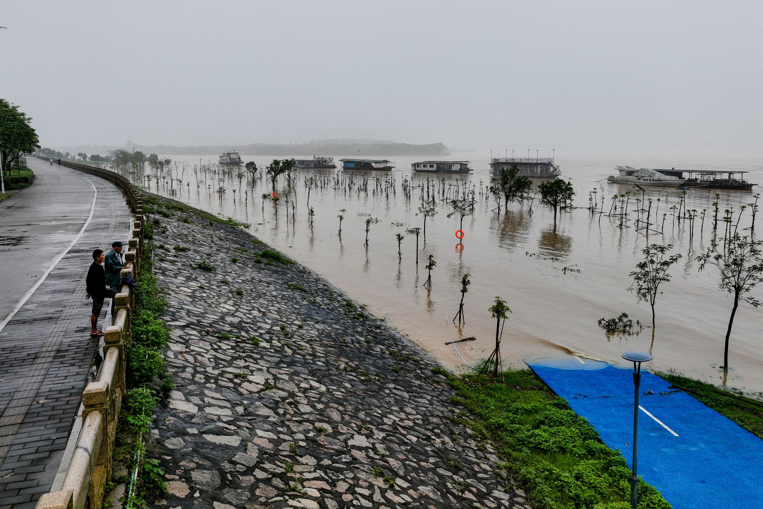 This aerial photograph taken on April 22, 2024 shows people standing on a walkway at a flooded area after heavy rains in Qingyuan, in southern China's Guangdong province. (Photo by AFP Photo/China Stringer Network)