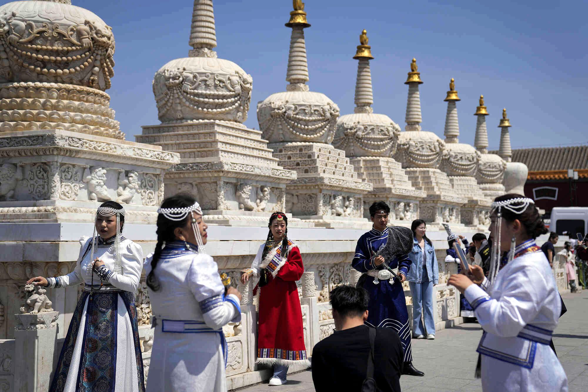 Tourists wearing ethnic minority costumes pose for souvenir photos taken at Dazhao Temple, a Tibetan Buddhist monastery, during a five-day holiday for international labor day in Hohhot, north China's Inner Mongolia Autonomous Region, Thursday, May 2, 2024. (Photo by Andy Wong/AP Photo)