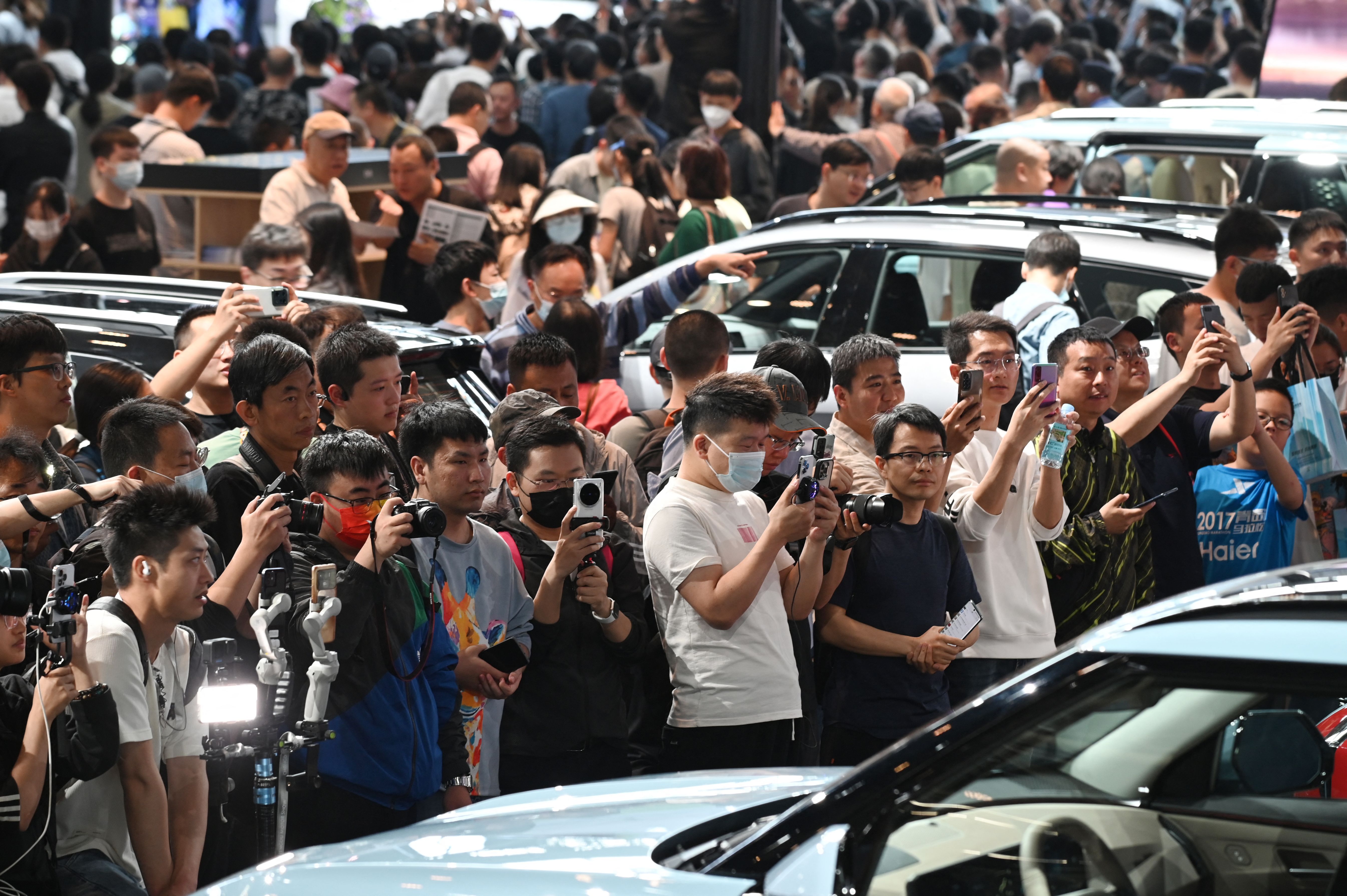 Crowds gather to view cars on the Kia stand at the Beijing Auto Show in Beijing on May 3, 2024. (Photo by Greg Baker/AFP Photo)