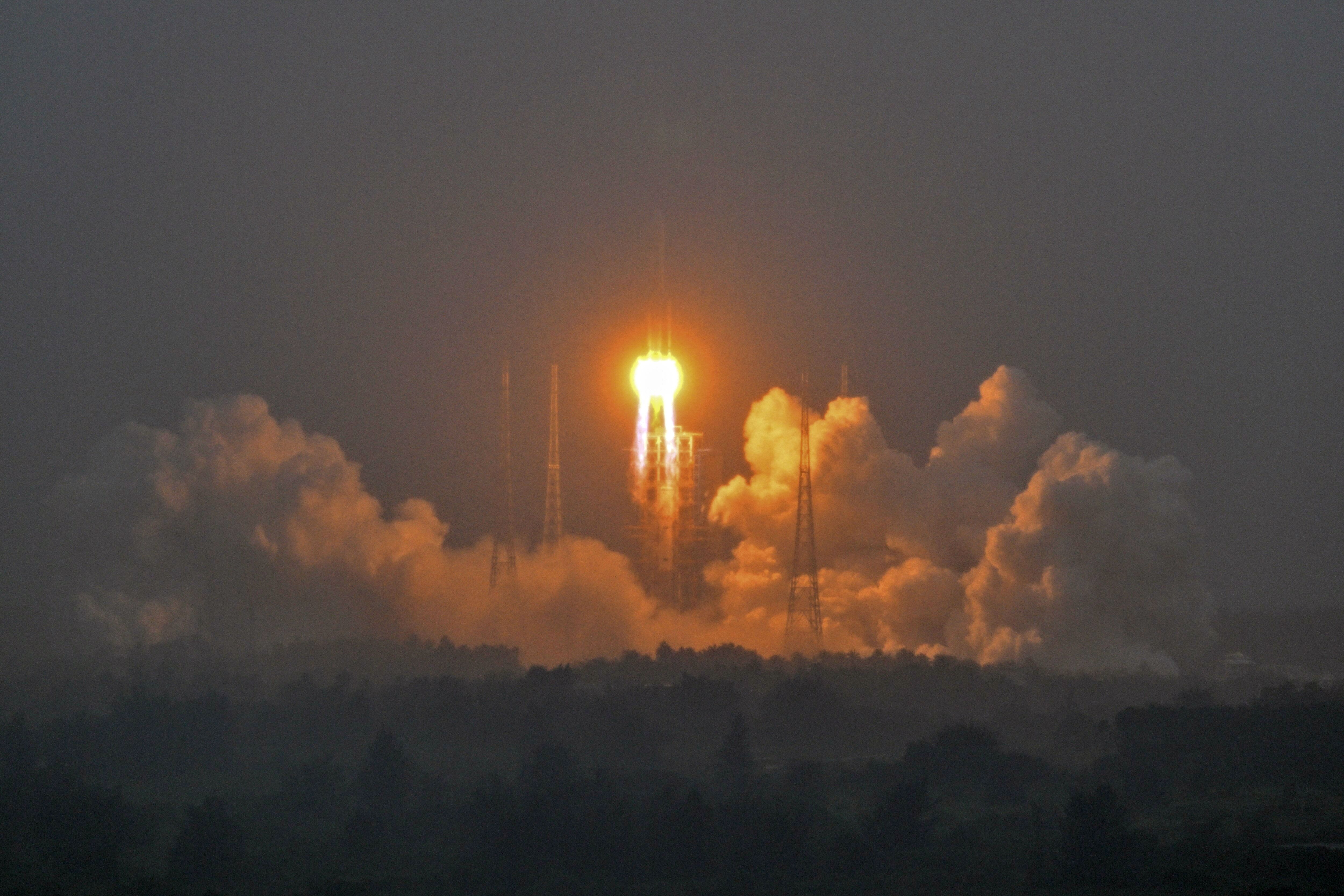 A Long March 5 rocket, carrying the Chang'e-6 mission lunar probe, lifts off as it rains at the Wenchang Space Launch Centre in southern China's Hainan Province on May 3, 2024. (Photo by Hector Retamal/AFP Photo)