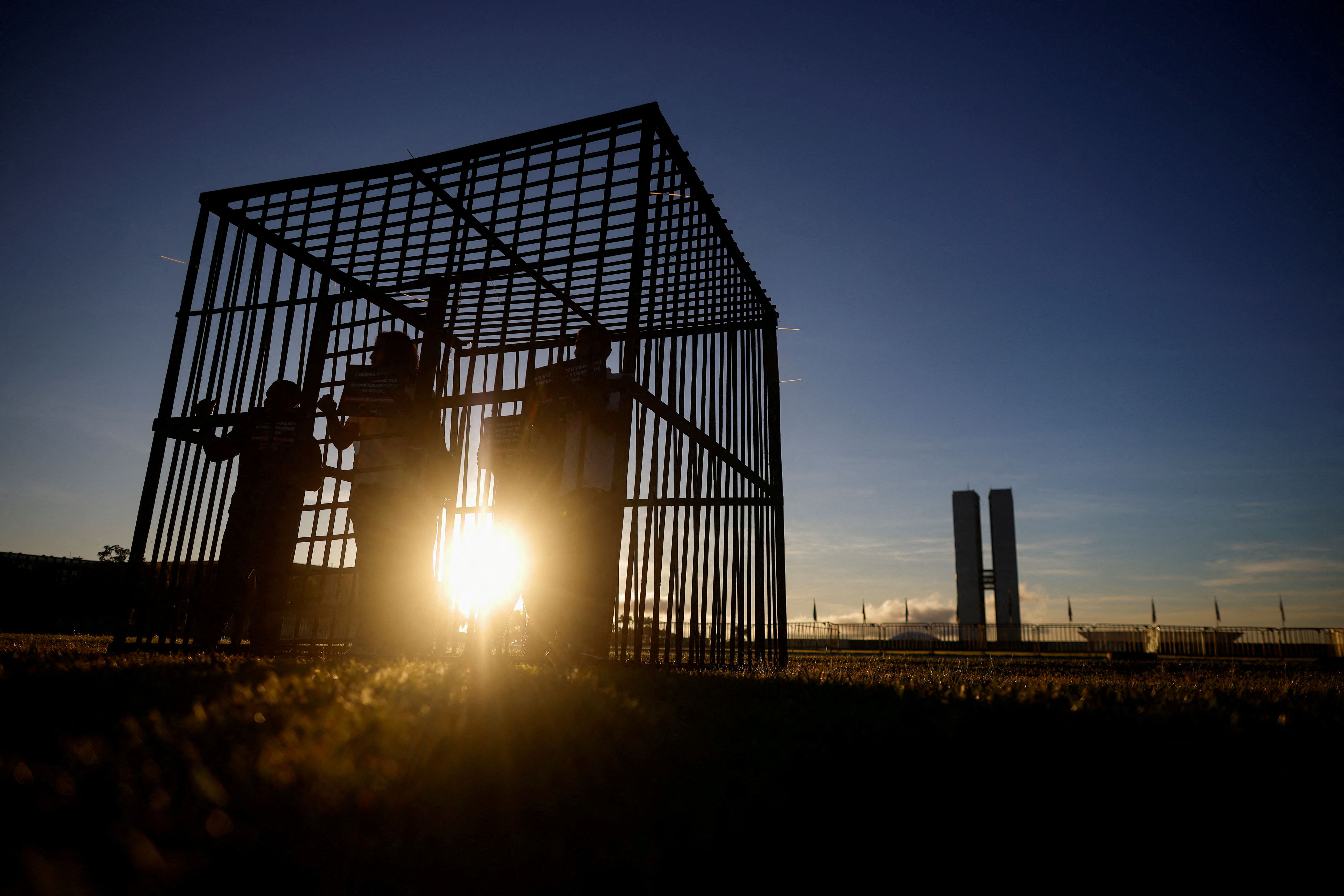 Activists stands in a mock prison cell during a protest against a bill on the possession and use of drugs, in front the National Congress, in Brasilia, Brazil on April 24, 2024. (Photo by Adriano Machado/Reuters)