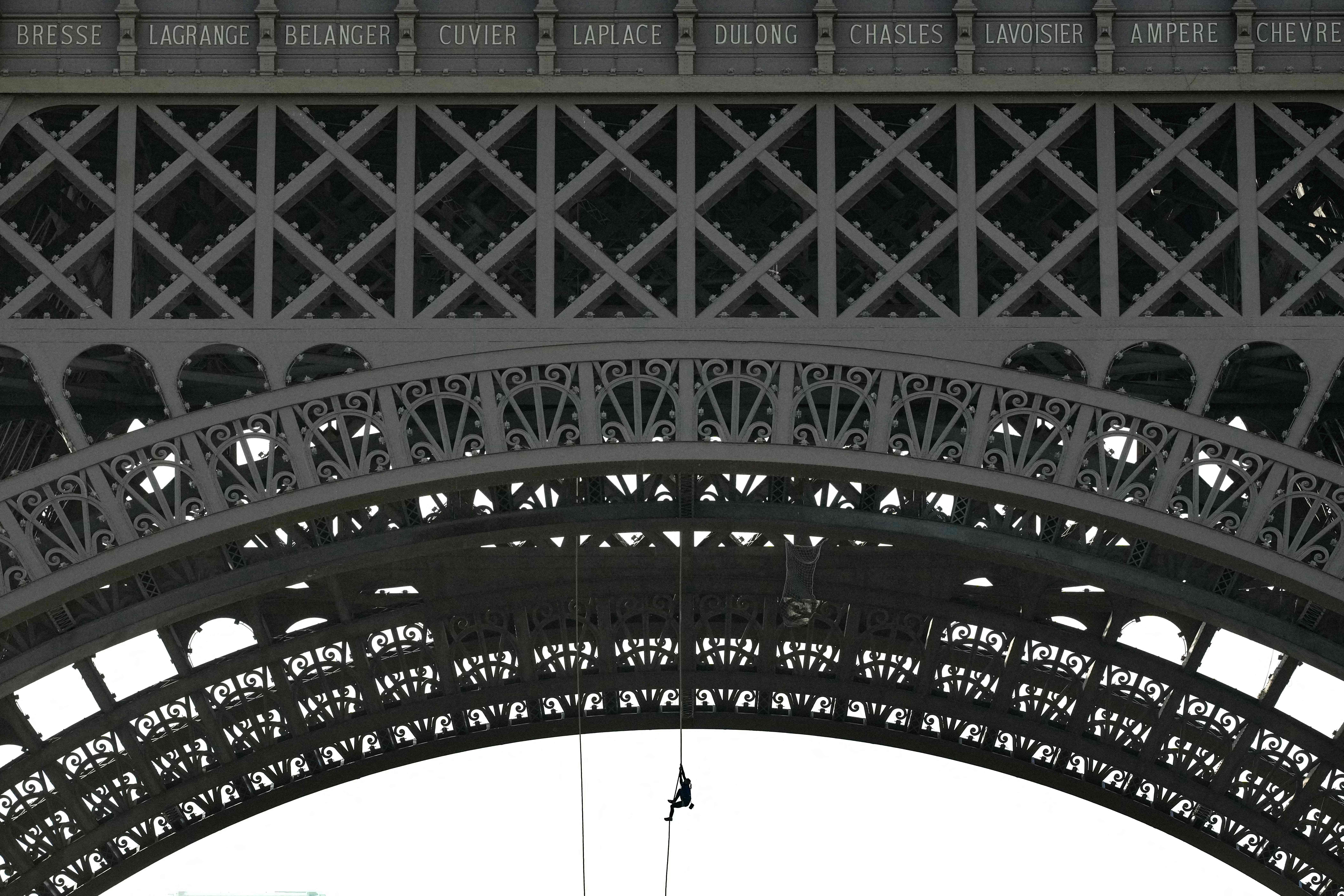 French athlete Anouk Garnier rope climbs up the Eiffel Tower in a bid to break the world record, at the Eiffel Tower in Paris, on April 10, 2024. (Photo by Dimitar Dilkoff/AFP Photo)
