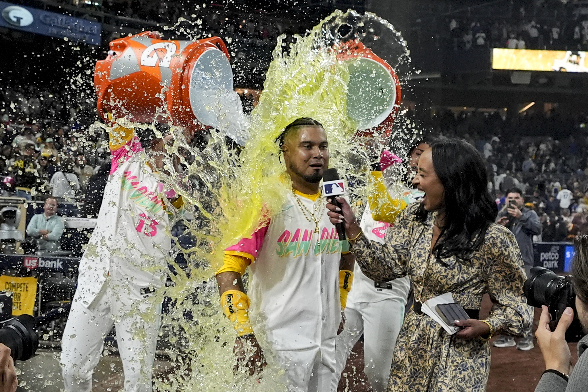 San Diego Padres' Luis Arraez is doused by teammates Manny Machado, left, and Fernando Tatis Jr. after hitting a walk-off single during the ninth inning of a baseball game against the Los Angeles Dodgers, Friday, May 10, 2024, in San Diego. The Padres won, 2-1. (Photo by Gregory Bull/AP Photo)