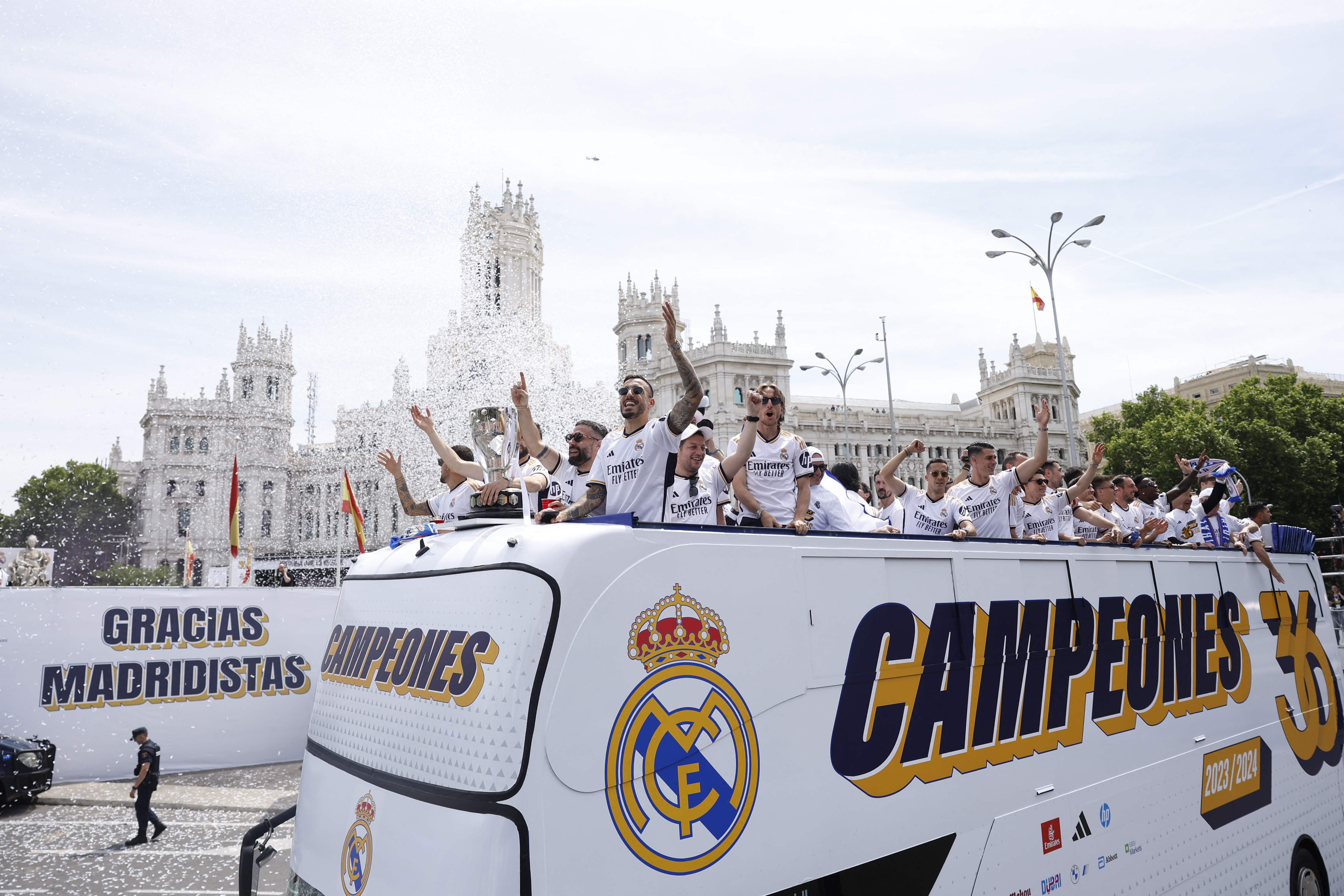 Real Madrid's Spanish forward #14 Joselu and teammates parade onboard a bus as they celebrate their 36th LaLiga trophy at the Cibeles square in Madrid on May 12, 2024. Real Madrid's fans line the streets of Madrid as 'Los blancos' celebrate their 36th Liga trophy before facing Borussia Dortmund at Wembley in the Champions League final on June 1. (Photo by Óscar del Pozo/AFP Photo)
