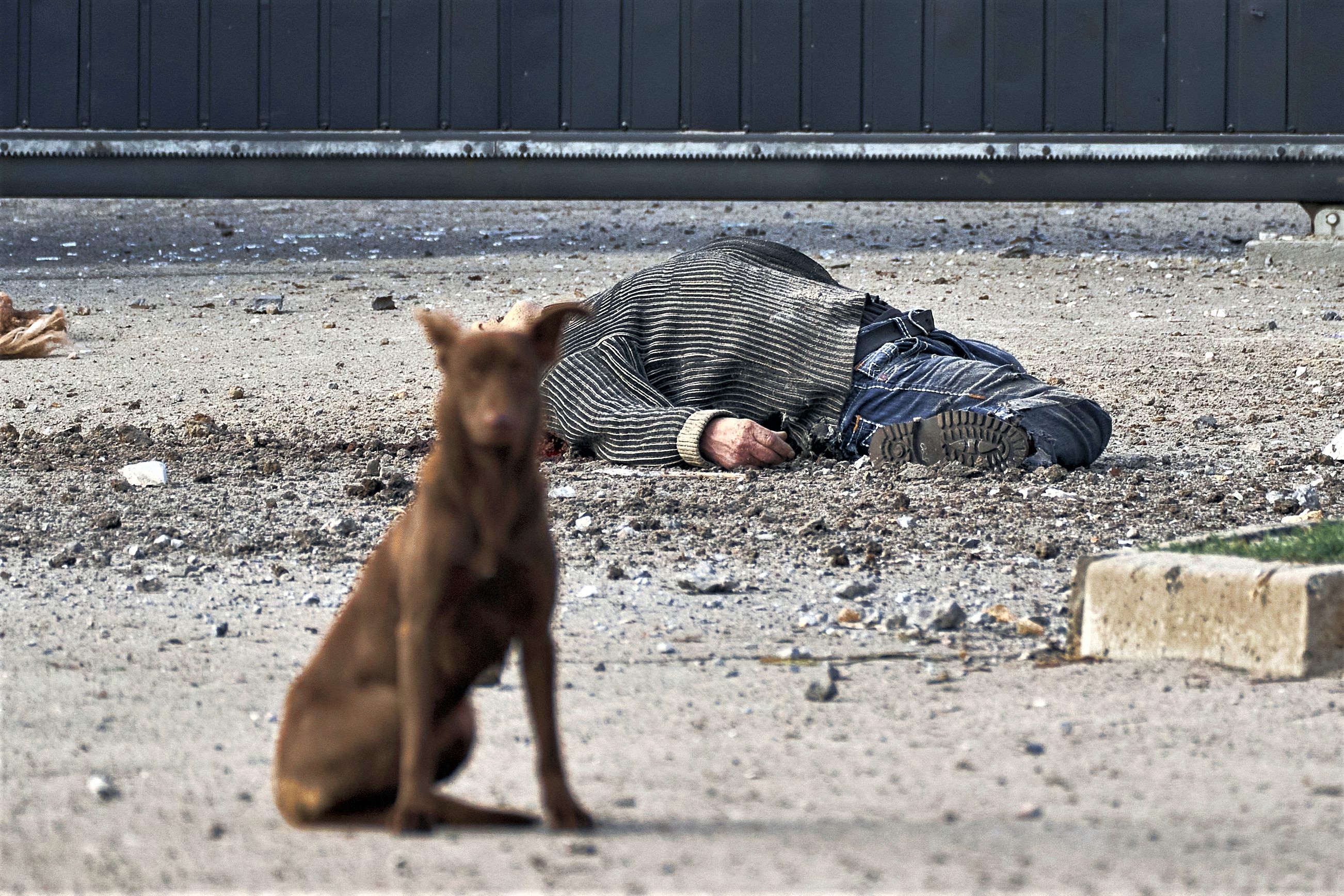 A stray dog sits near the dead body of a local citizen, killed in Russian shelling that hit an industrial area in Kherson, Ukraine, Friday, February 3, 2023. (Photo by LIBKOS/AP Photo)