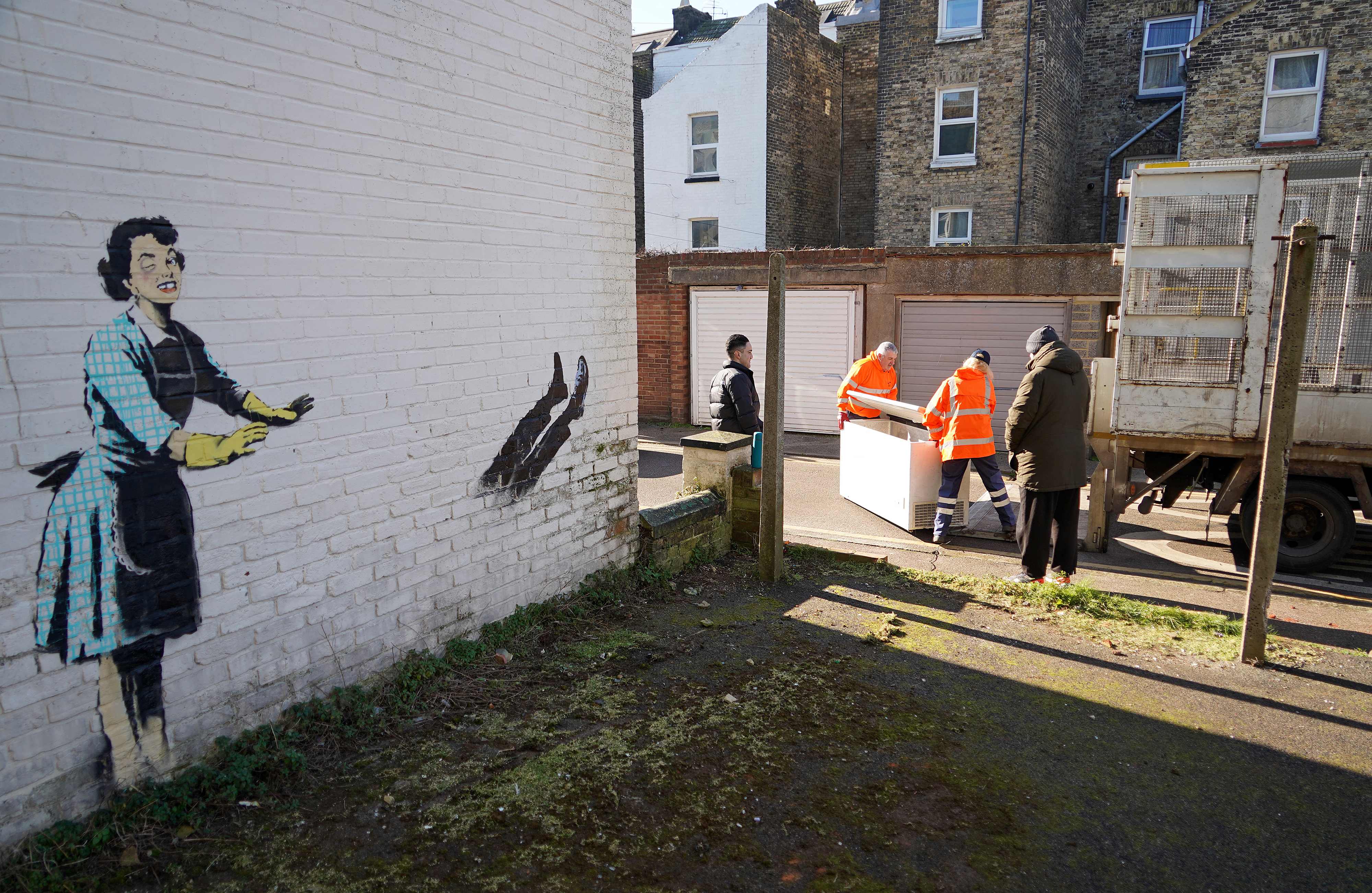 Workers remove a chest freezer that had formed part of an artwork, acknowledged to by street artist Banksy, from the side of a house in Margate, south east England on February 14, 2023. The artwork appears to show a a 1950s housewife with a swollen eye, missing a tooth, and apparently shutting a man in a freezer. The freezer was later removed by council workers. (Photo by William Edwards/AFP Photo)