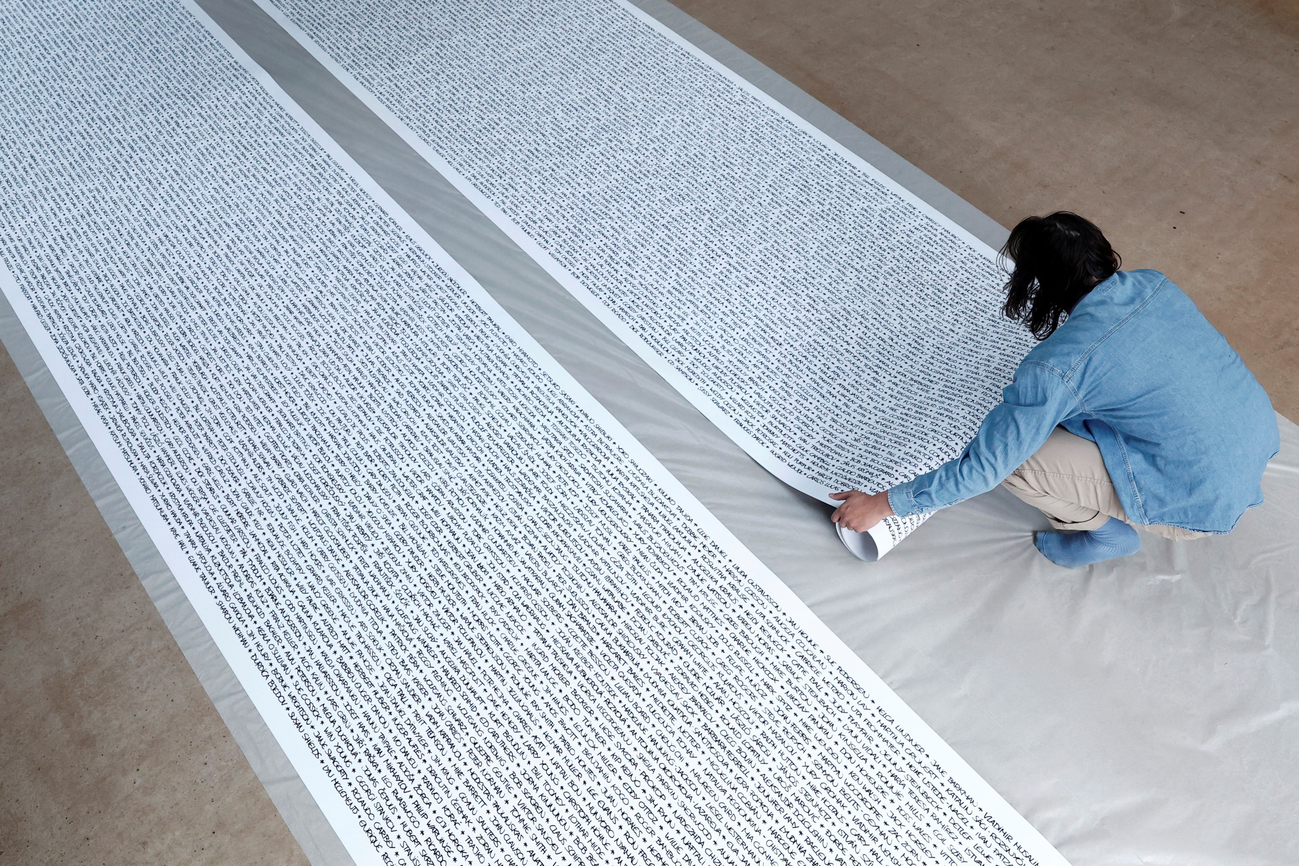 French artist Baptiste Chebassier unrolls his artwork, made from rolls of recycled paper on which names of 30,249 Olympic medallists will be written, at the Chebassier workshop in Saint-Ouen, near Paris, France, on April 5, 2024. (Photo by Noemie Olive/Reuters)
