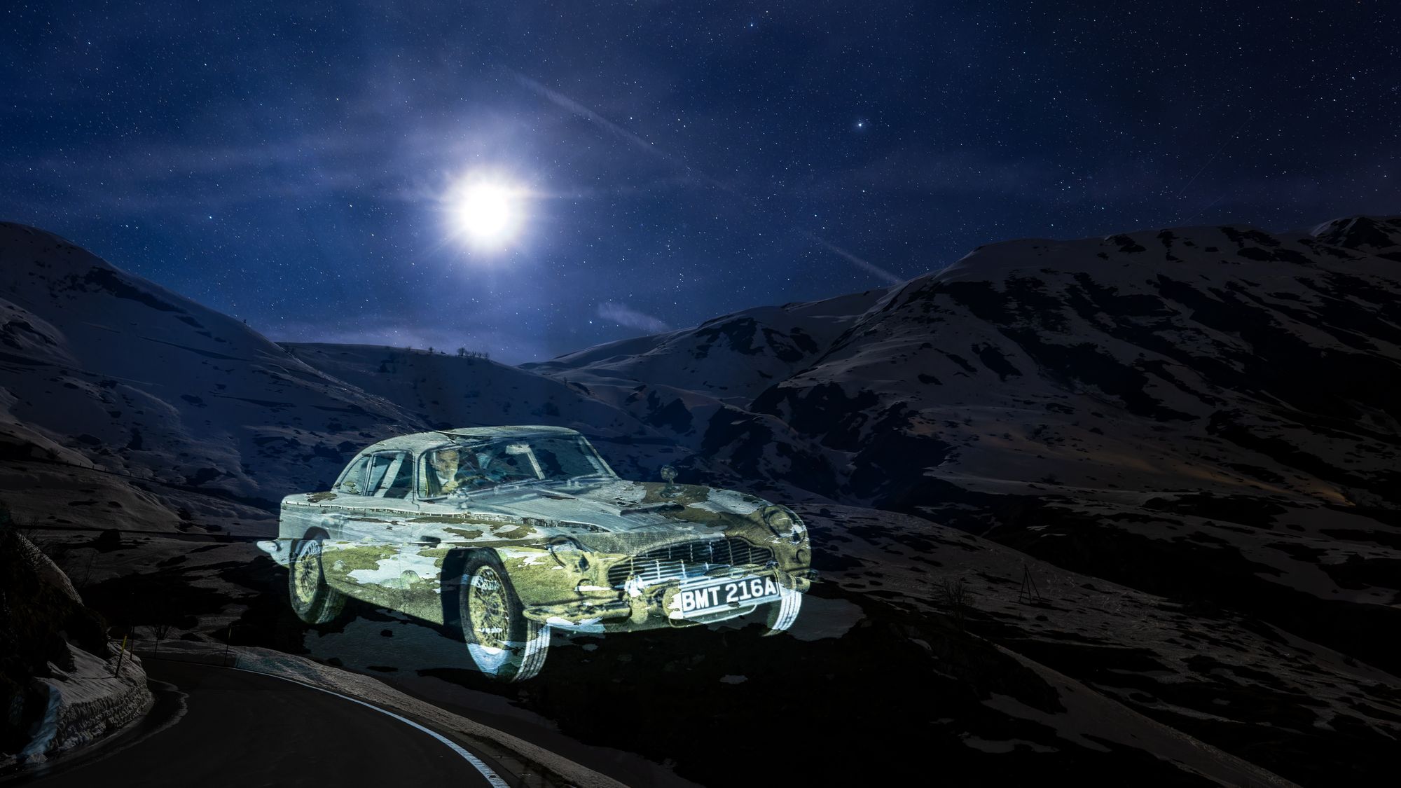 Swiss light artist Gerry Hofstetter illuminates the snow walls and mountains of the Furka Pass in Andermatt Swiss Alps to commemorate the iconic car chase scene from James Bond's Goldfinger, which took place in the town 60 years ago this summer on April 13, 2024 in Andermatt, Switzerland. The 300m projection series marks the start of the 60th anniversary celebrations in Andermatt which include a film festival, a special showcase of the original Aston Martin DB5 Vantage driven by Sean Connery, an exhibition of archive materials from the movie, opportunities to drive the Pass and outdoor mountaintop screenings of the movie. (Photo by Philipp Schmidli/Getty Images for Andermatt Swiss Alps)