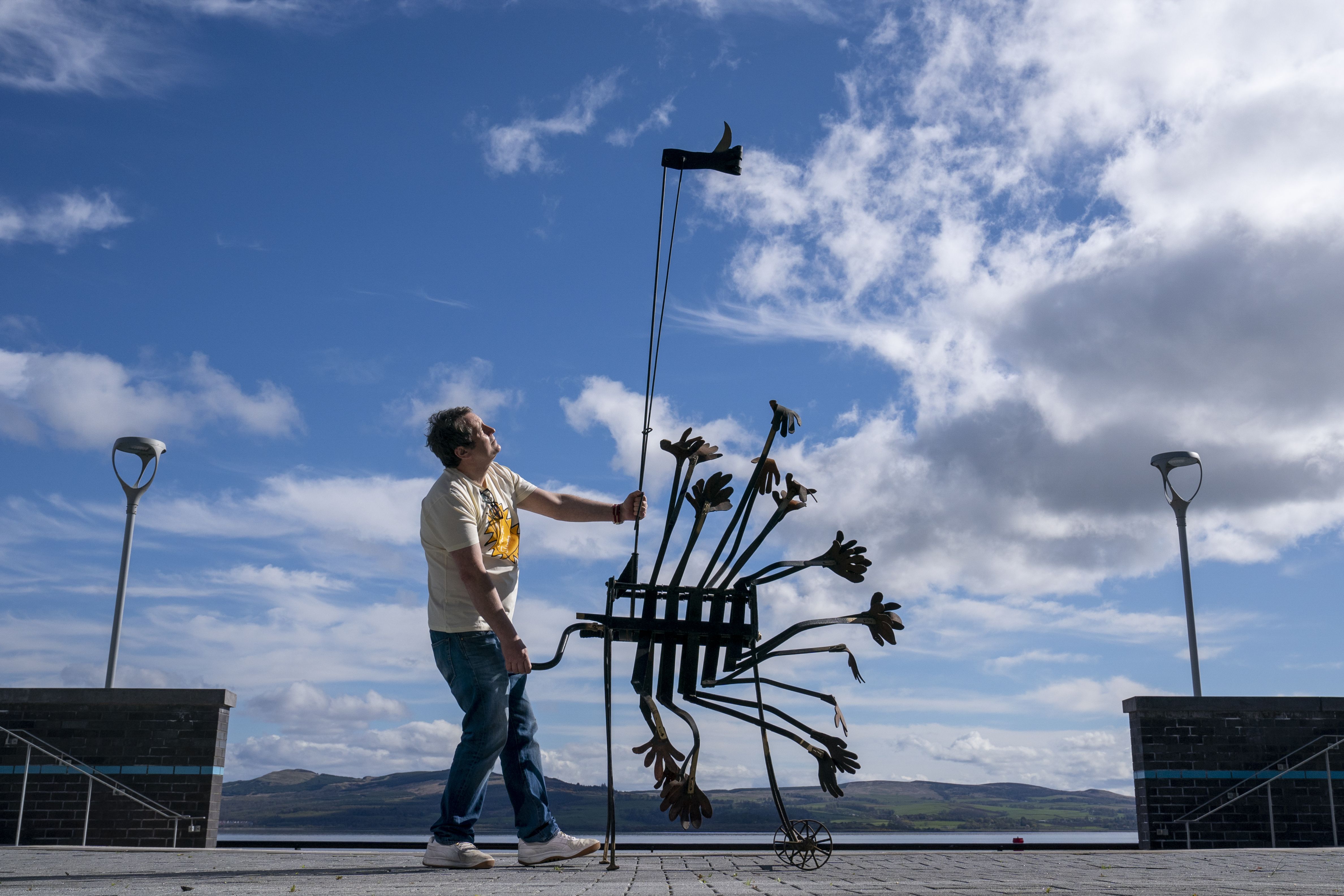 Artist and general manager Willie Sutherland with “Machine For Applauding Paintings (with Critic's Thumb Attachment)” during a photocall for The Wyllieum, a new gallery dedicated to George Wyllie in Greenock, UK on Thursday, April 25, 2024. (Photo by Jane Barlow/PA Images via Getty Images)