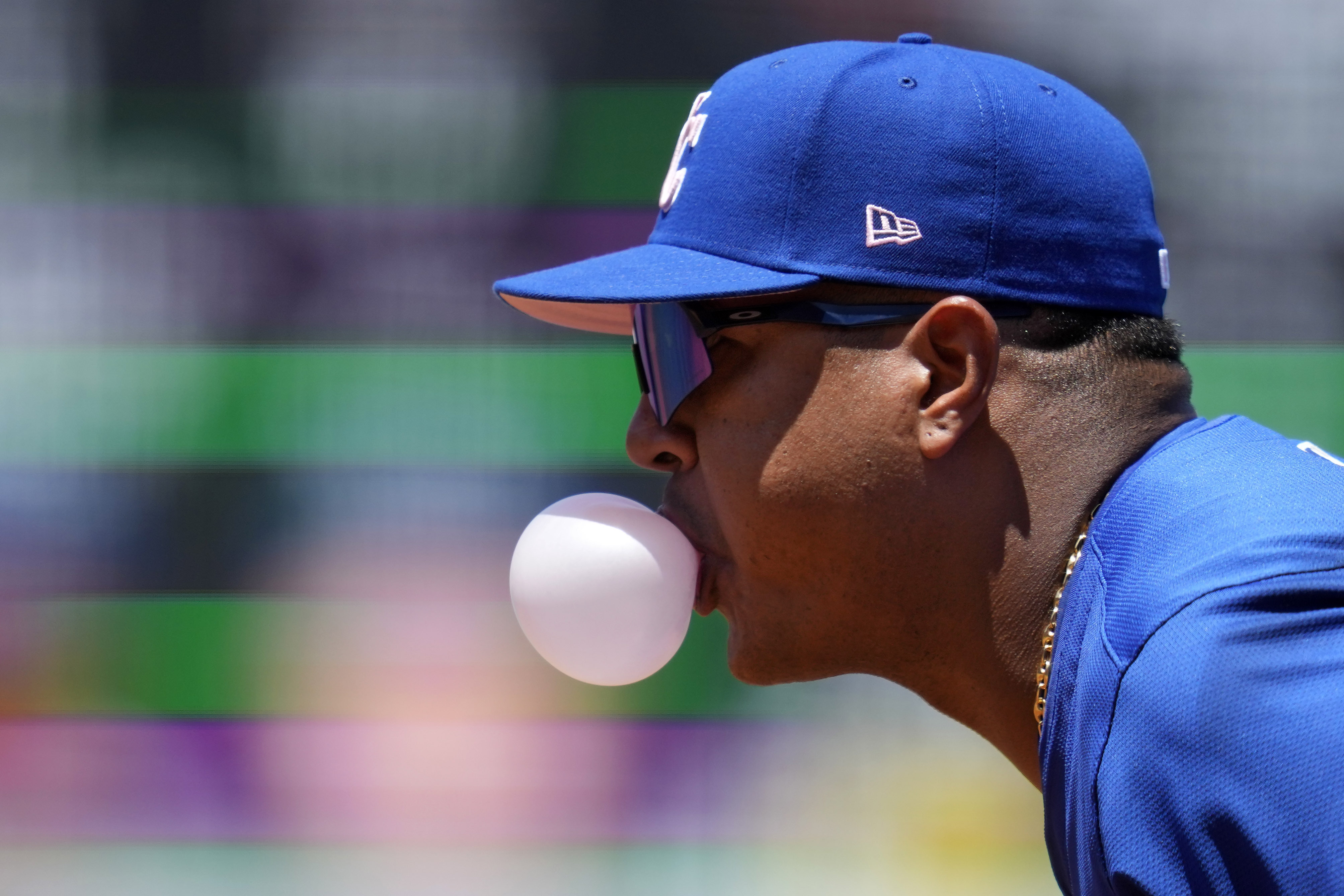 Kansas City Royals first baseman Salvador Perez blows a bubble during the second inning of a baseball game against the Los Angeles Angels Sunday, May 12, 2024, in Anaheim, Calif. (Photo by Ashley Landis/AP Photo)
