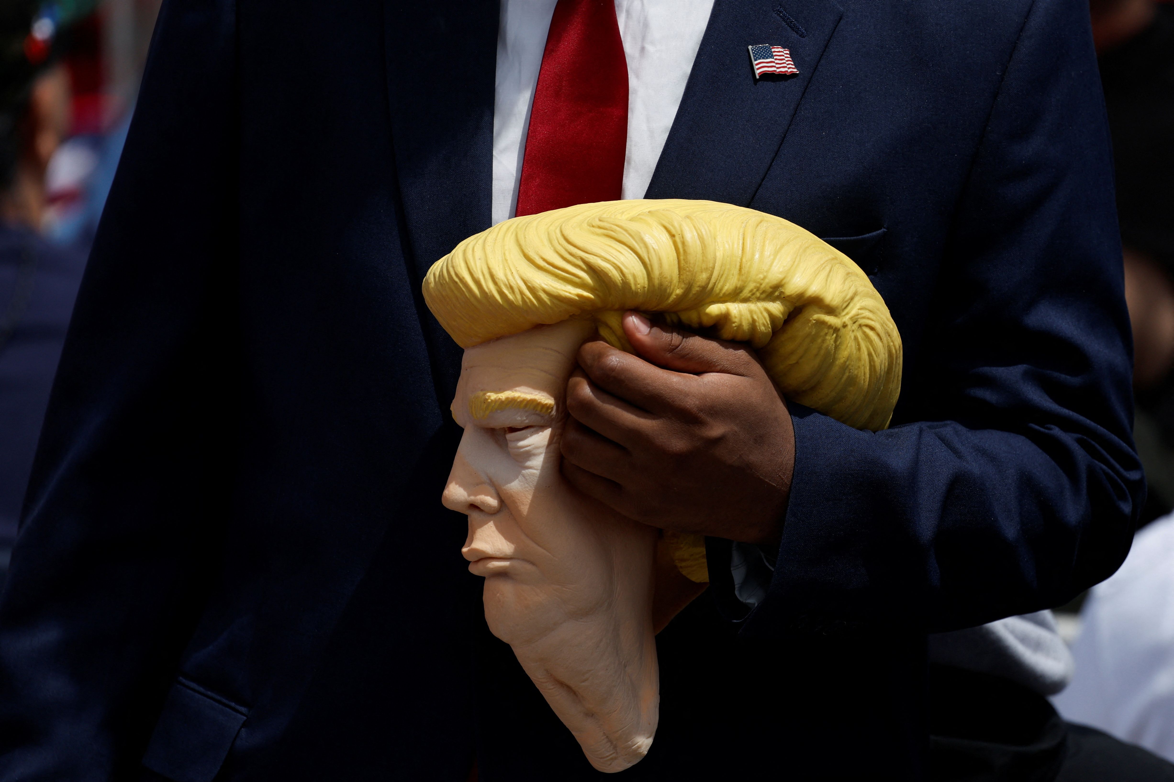 A man holds a mask depicting former U.S. President and Republican presidential candidate Donald Trump on the day of his campaign rally in Wildwood, New Jersey, U.S., May 11, 2024. (Photo by Evelyn Hockstein/Reuters)